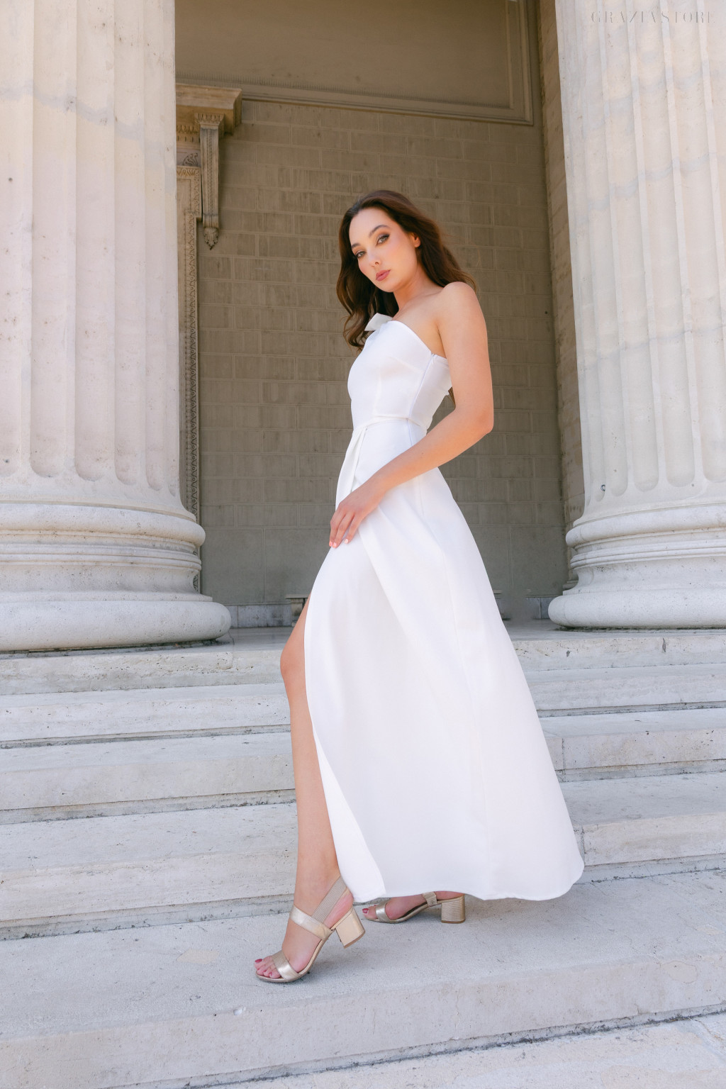 Linda fehér matt anyagú maxi ruha - Féloldalas alkalmi ruha masnival