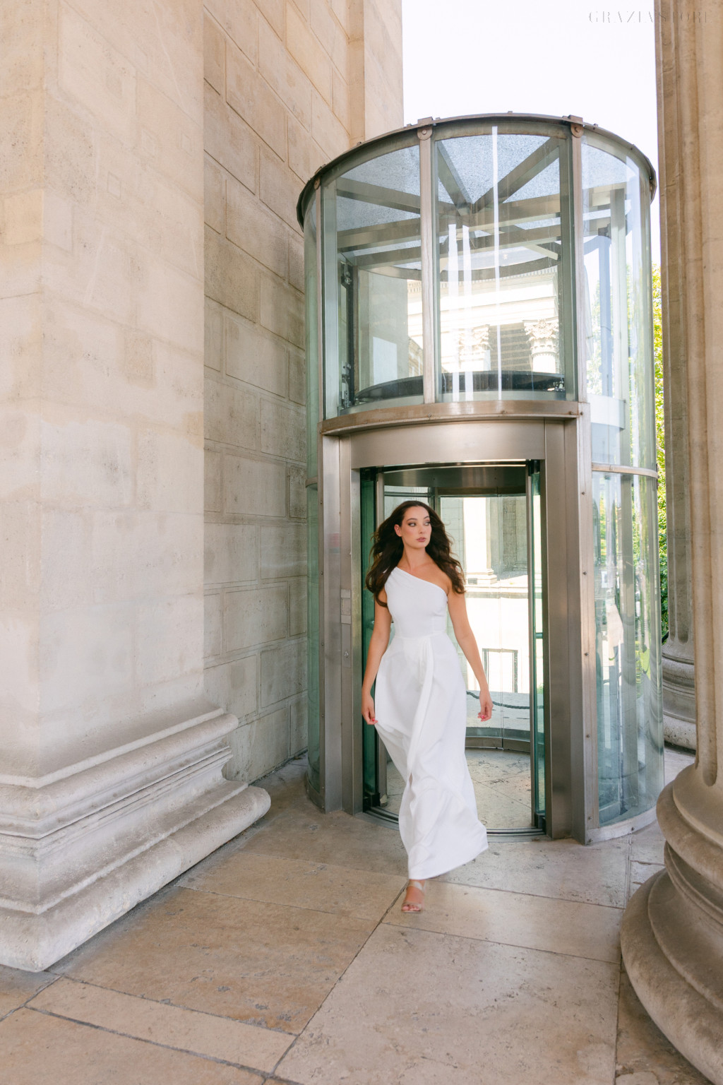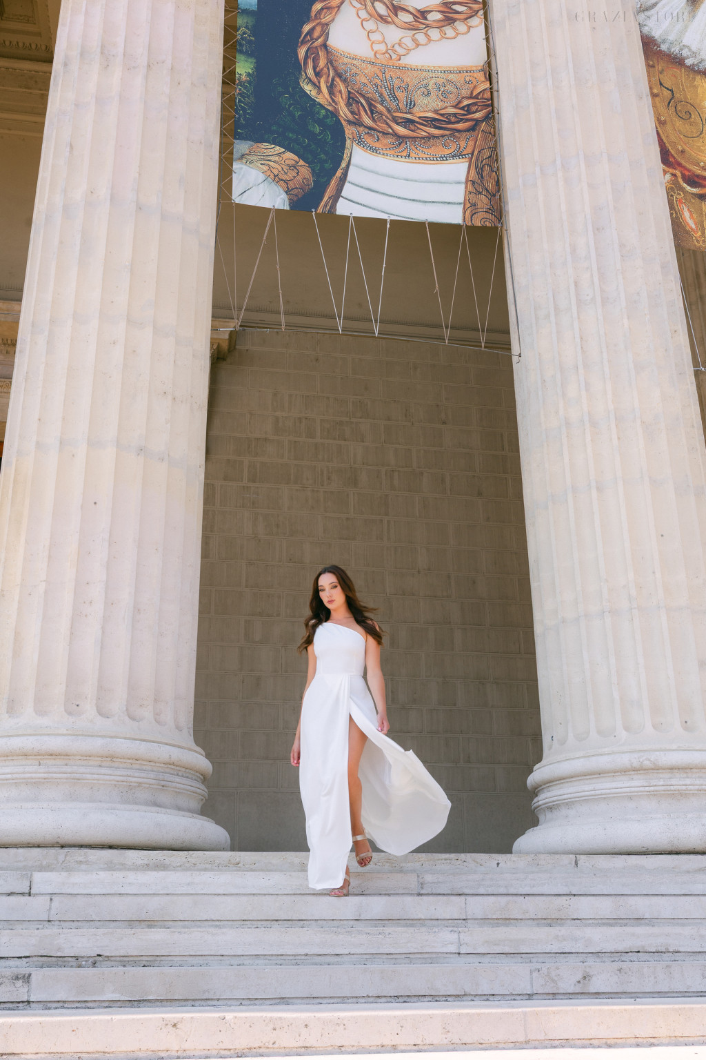 Féloldalas felsőrésze egyedi és modern vonalat ad a megjelenésnek, miközben finom masnis díszítése bájos, nőies kiegészítőként emeli ki a vállat. A szoknya átlapolt szabása lágyan követi a mozgást, áramló sziluettet kölcsönözve, amely minden lépésnél romantikus könnyedséget sugároz.