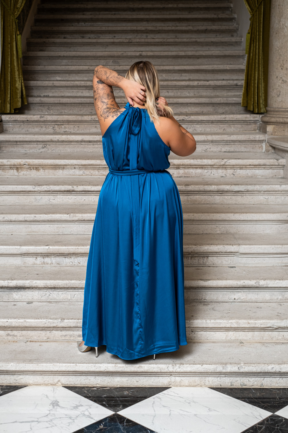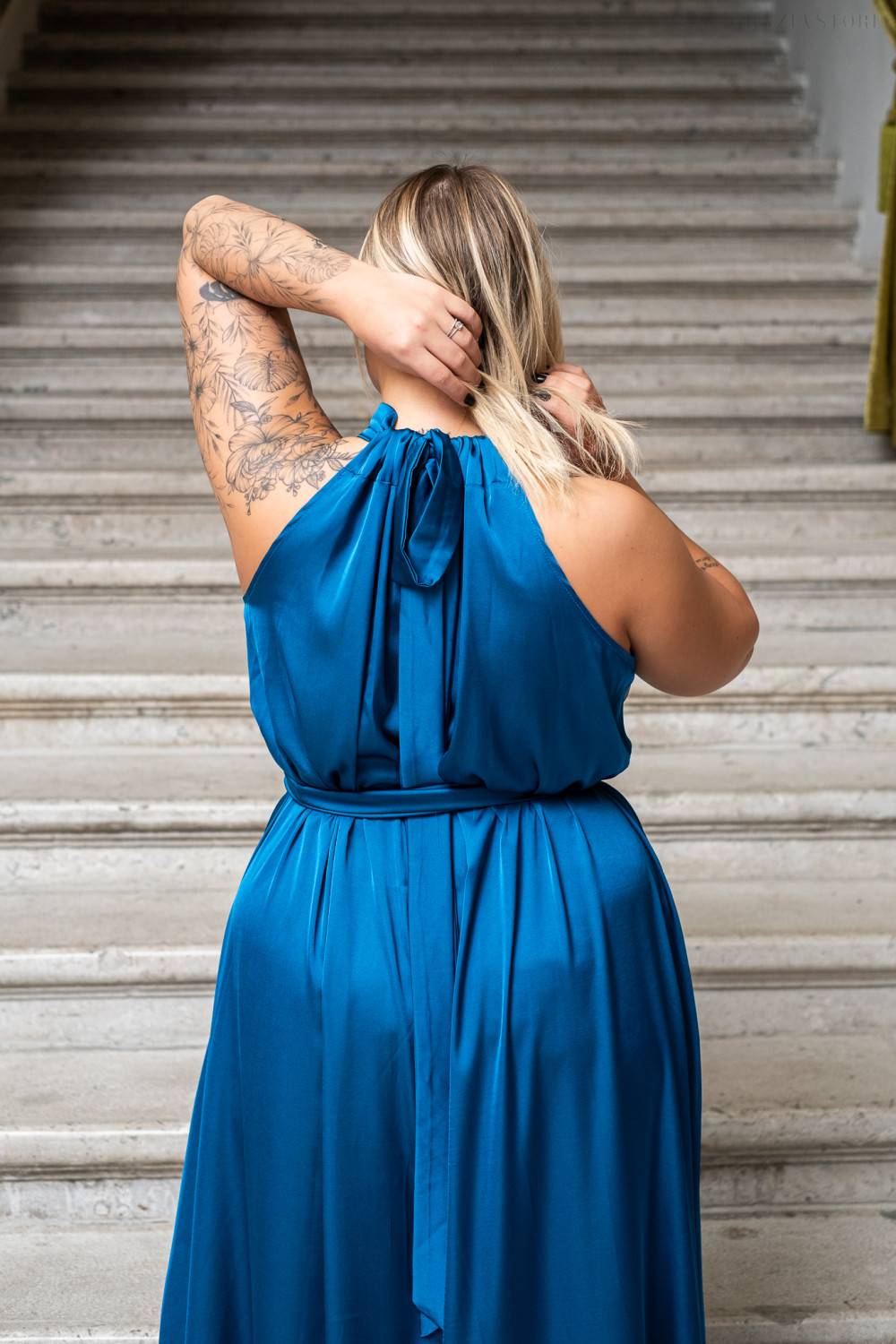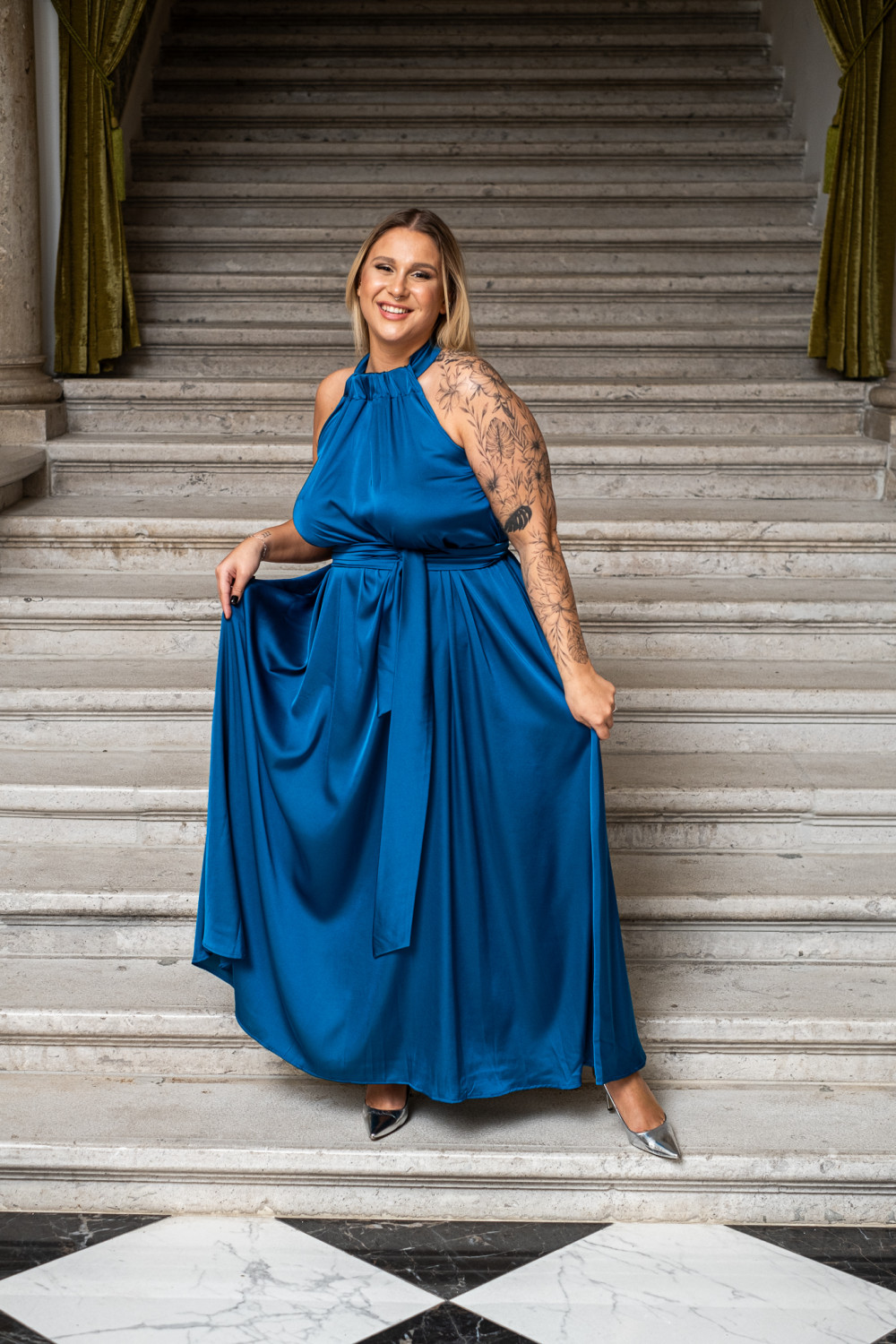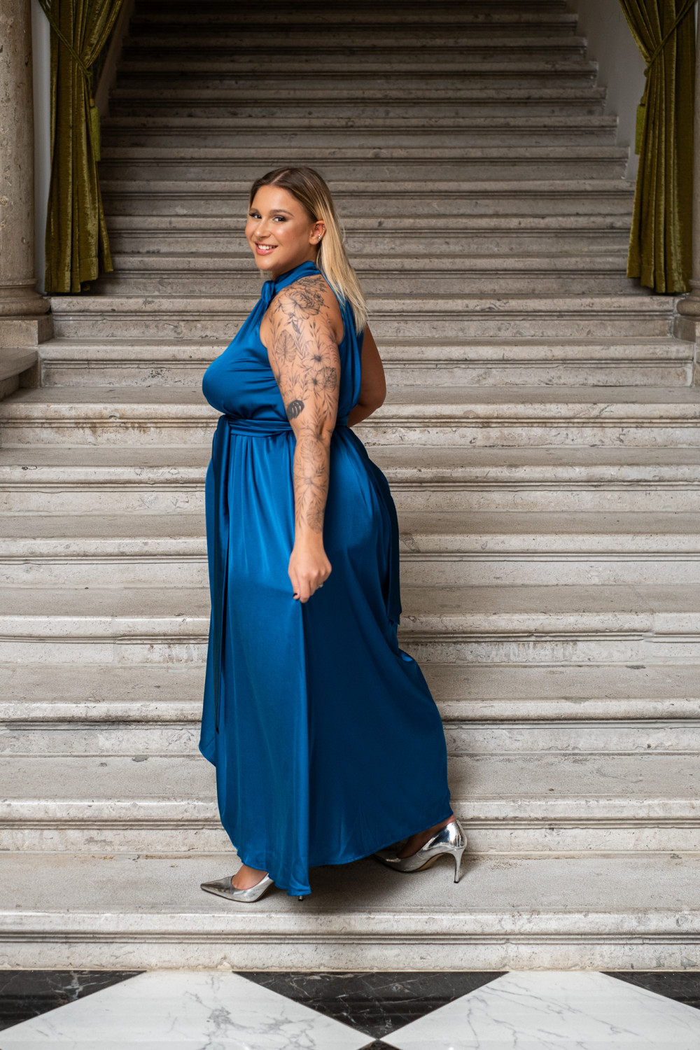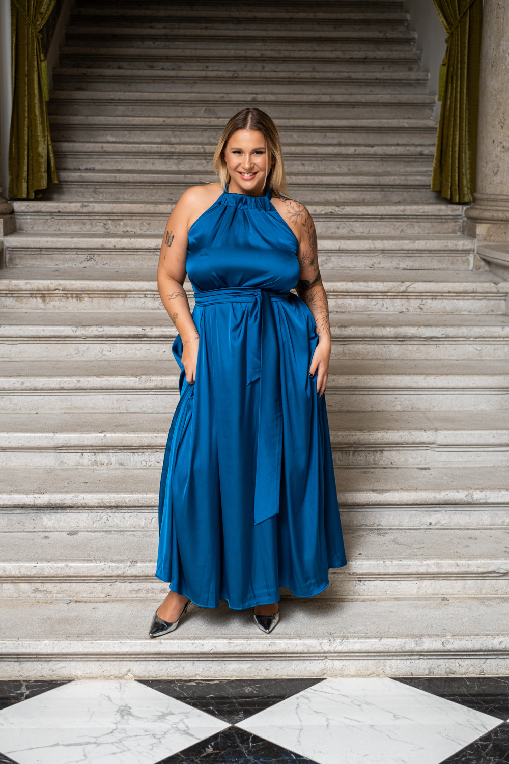 Olga ruhánk egyik kiemelkedő jellemzője, hogy a karok teljesen szabadon vannak hagyva, ezáltal lehetővé téve a szabad mozgást és a légies megjelenést. A ruha megkoronázása pedig a nyakban megkötött szalagokon rejlik, melyek egyenesen a divat világából inspirálódnak. A szalagok megkötése nem csupán divatos, hanem kreatív lehetőséget is kínál viselőjének. Bár a masni most különösen trendi, a szalagokat számtalan módon lehet kötni és variálni, így mindenki megtalálhatja a saját egyéniségéhez és stílusához leginkább illő megoldást. Legyen szó lazán lelógó csomóról vagy elegánsan megkötött masniról, Olga lehetőséget ad arra, hogy a viselő kifejezze saját kreativitását és stílusát, miközben magabiztosan és elegánsan mutatkozik.