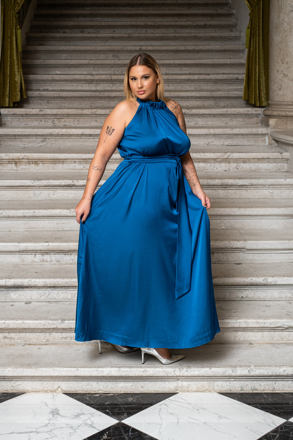 Az elől ráncolt nyak részlete finom és nőies megjelenést kölcsönöz a ruhának. A sötétkék színű light szatén anyag luxus hatást biztosít, miközben kényelmes viseletet nyújt.
