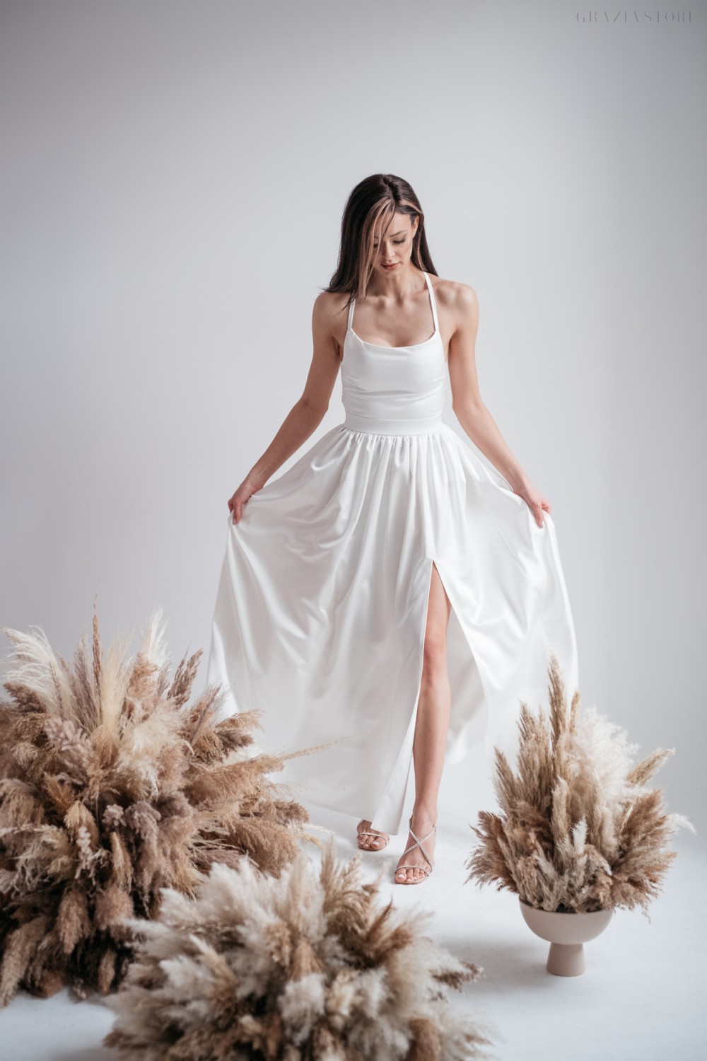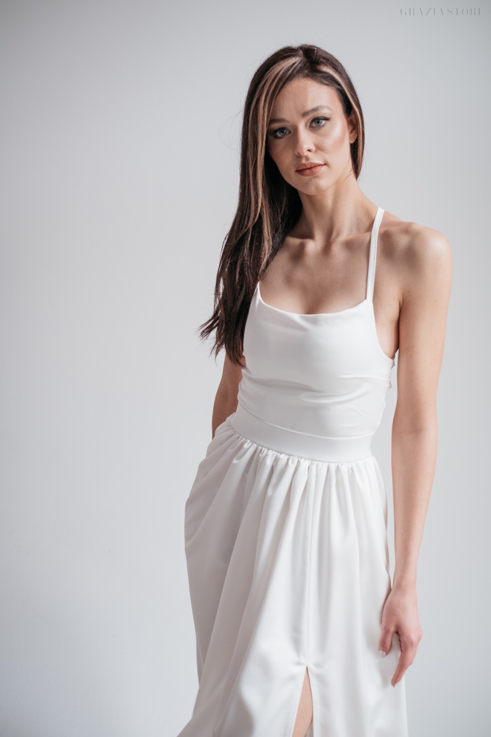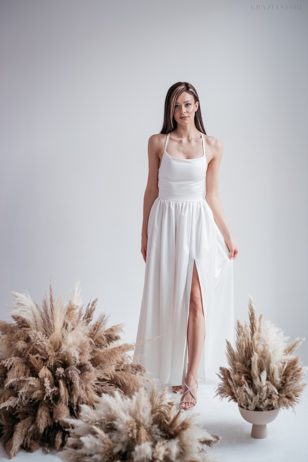 Madleine – fehér szatén maxi ruha hátán pántokkal