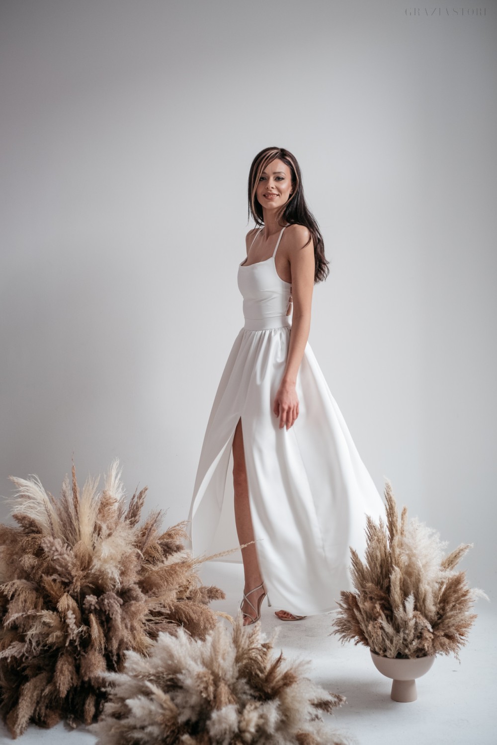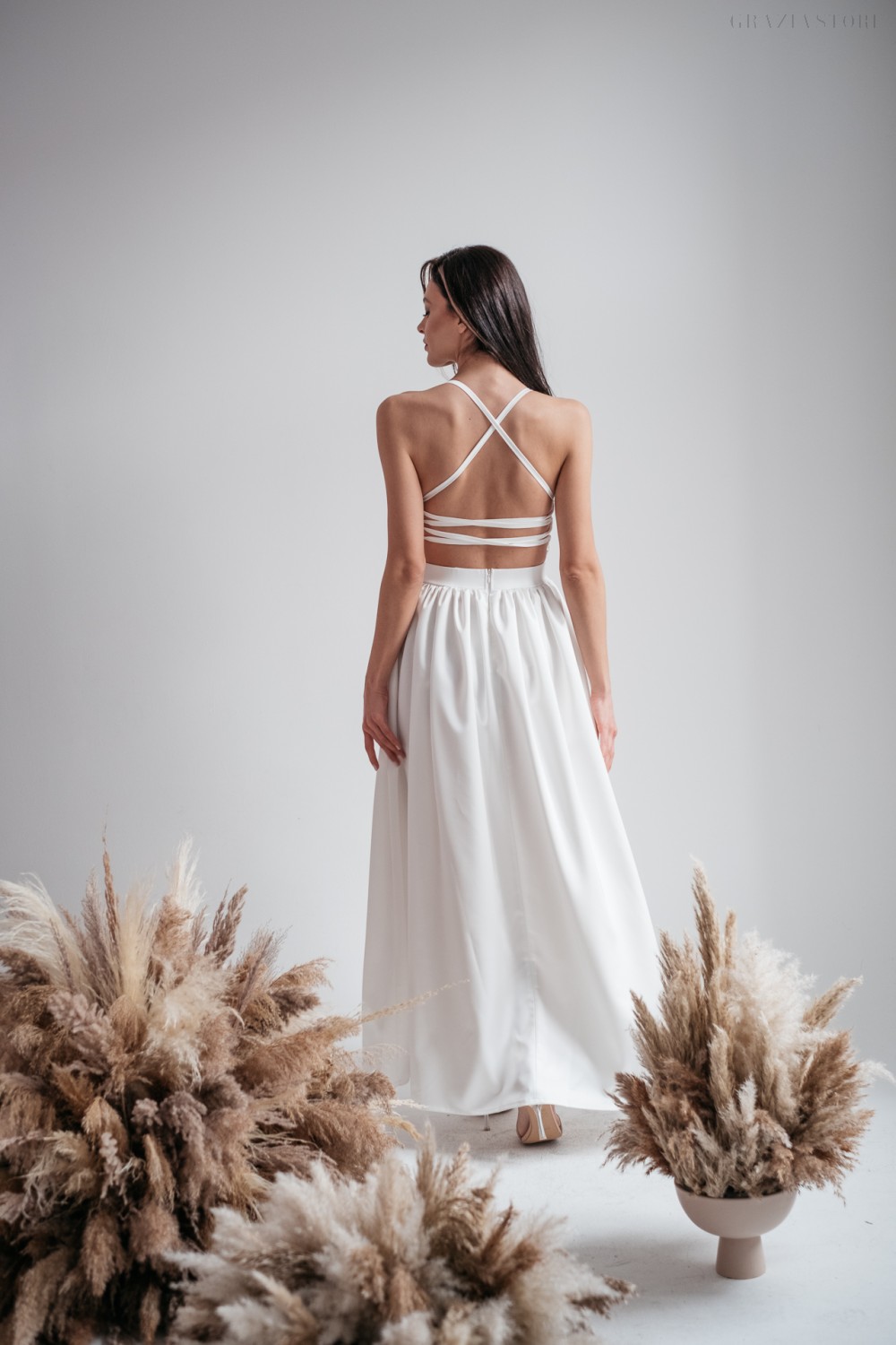 Fehér maxi ruha, hátán fűzős, keresztpántos megoldással. Enyhén fényes szatén anyagból készült, így rendkívül ünnepélyes viselet.