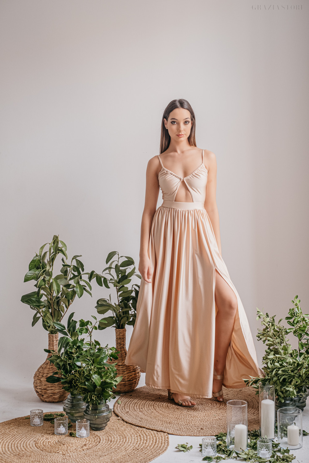 Válaszd ezt a szexisen elegáns pezsgő színű maxi ruhát, hogy minden alkalommal fiatalos és lenyűgöző megjelenést biztosíts magadnak, és hagyd, hogy a ruha divatos varázsa ragyogjon ki!