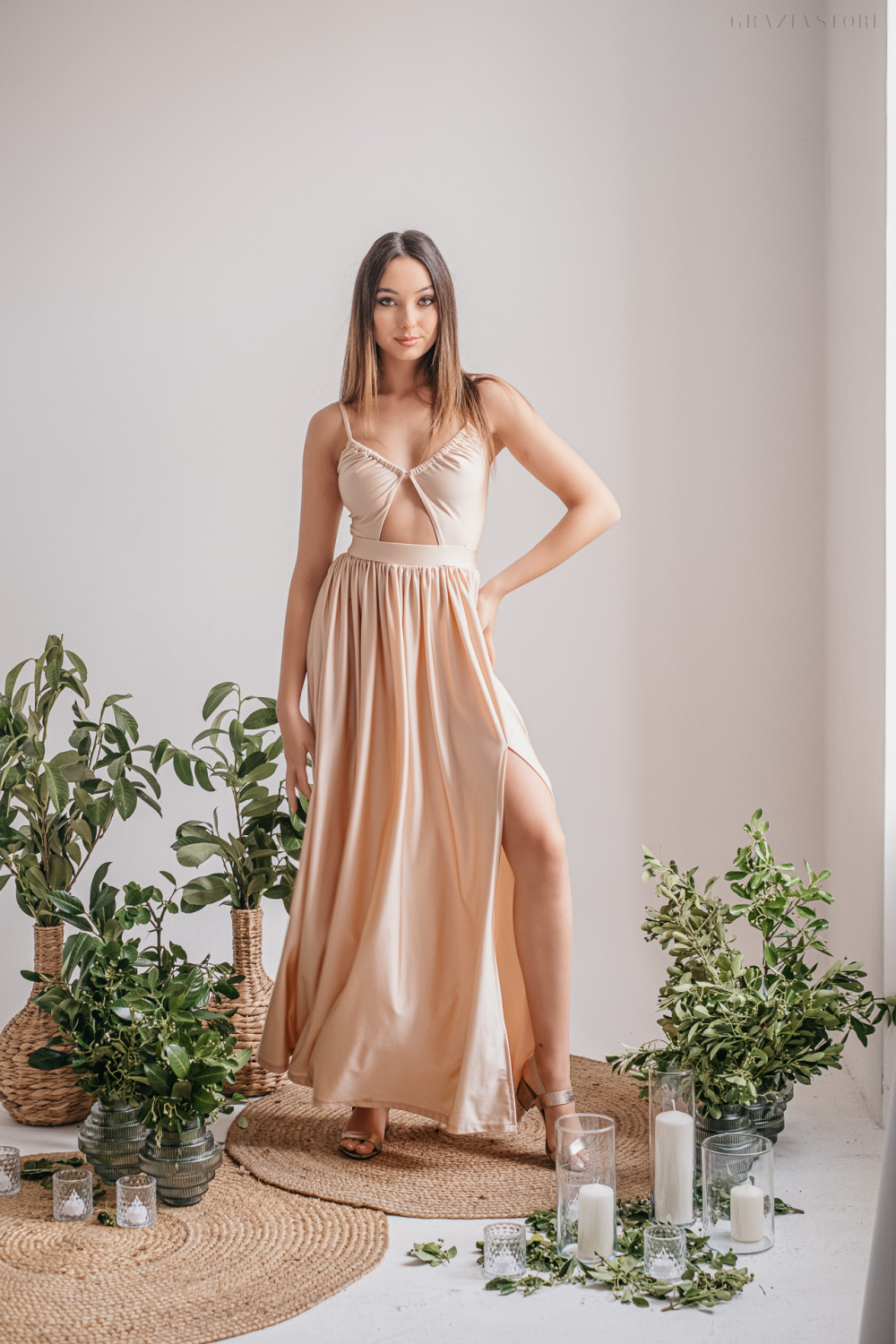 Igazán különleges, hasrészén kivágott, pezsgő színű (make up) maxi ruha, fényes, elasztikus anyagból.