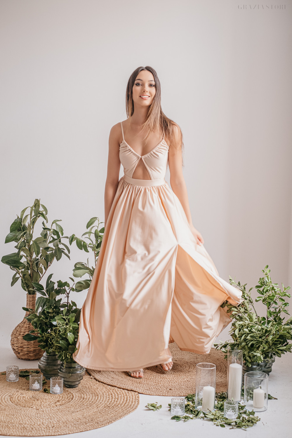 Igazán különleges, hasrészén kivágott, pezsgő színű (make up) maxi ruha, fényes, elasztikus anyagból.