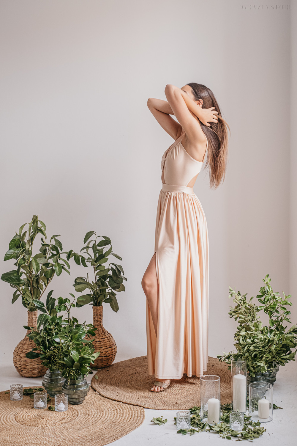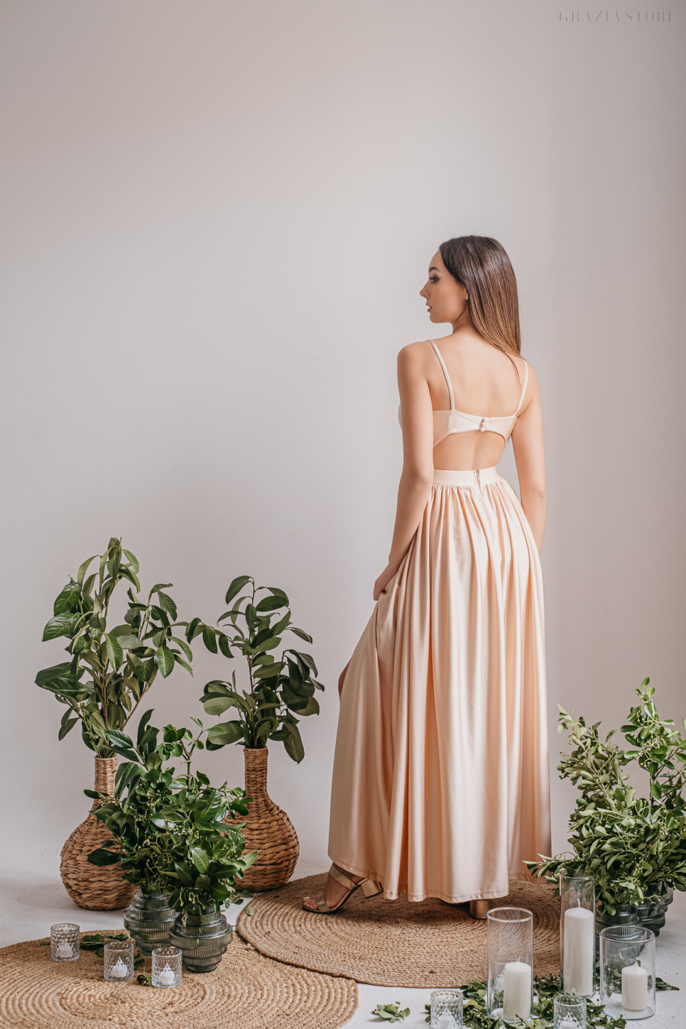 Válaszd ezt a szexisen elegáns pezsgő színű maxi ruhát, hogy minden alkalommal fiatalos és lenyűgöző megjelenést biztosíts magadnak, és hagyd, hogy a ruha divatos varázsa ragyogjon ki!