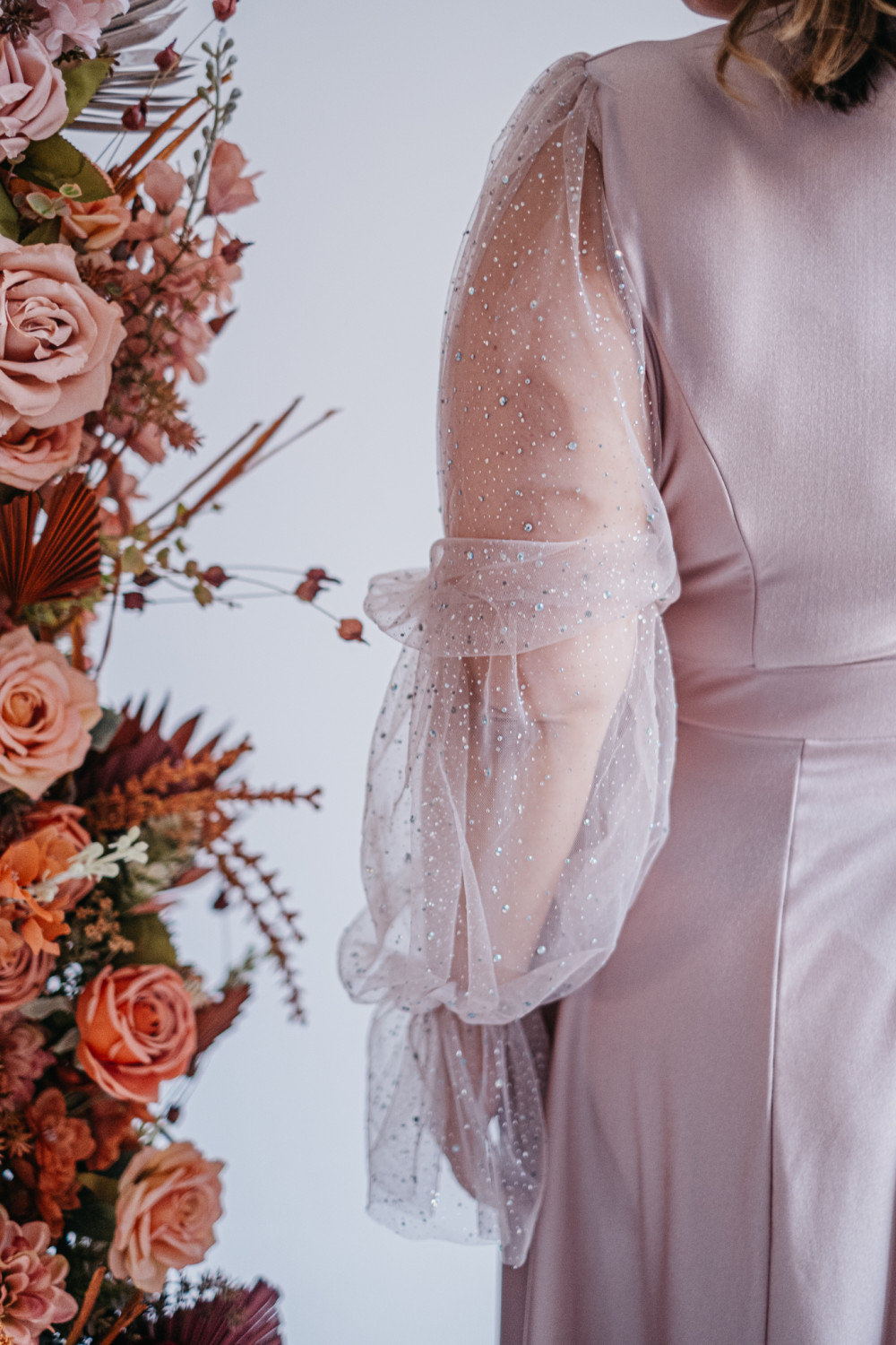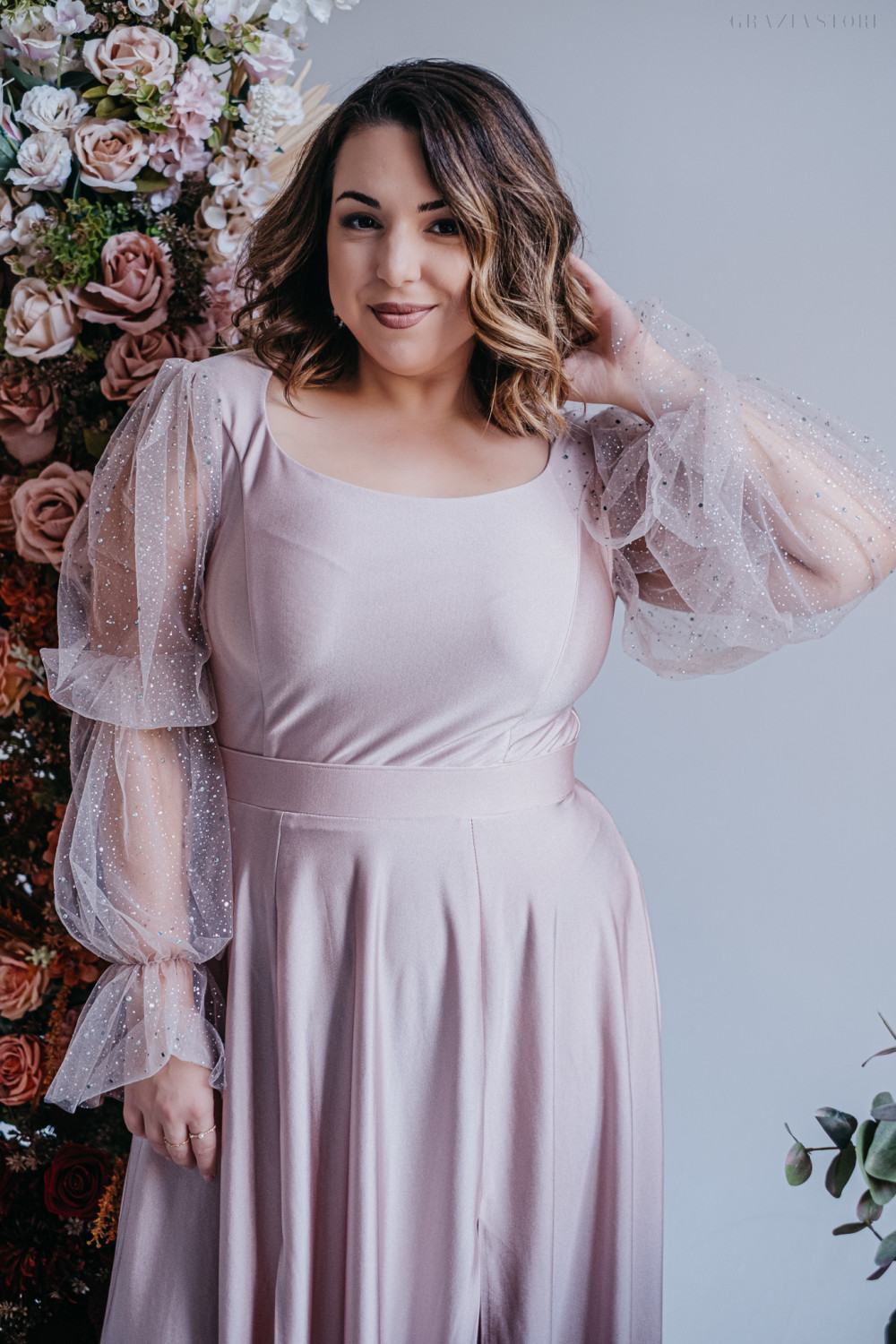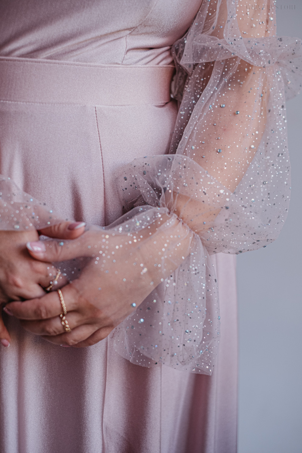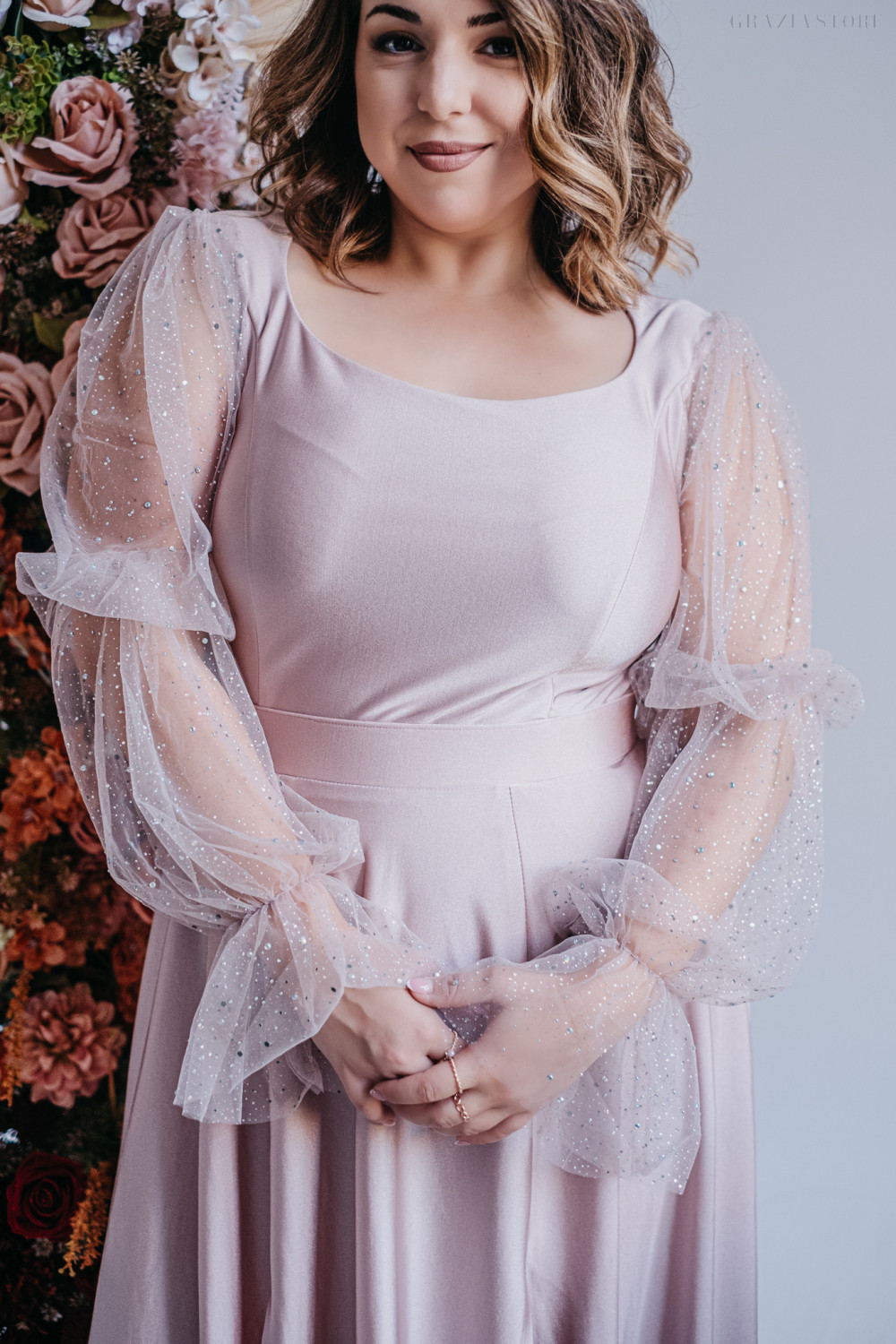 U dekoltázsú, derékban szabott maxi ruha, mélyen felsliccelt szoknyával és romantikus, hosszú, strasszköves tüll ujjakkal, púder színben, fényes, elasztikus anyagból.