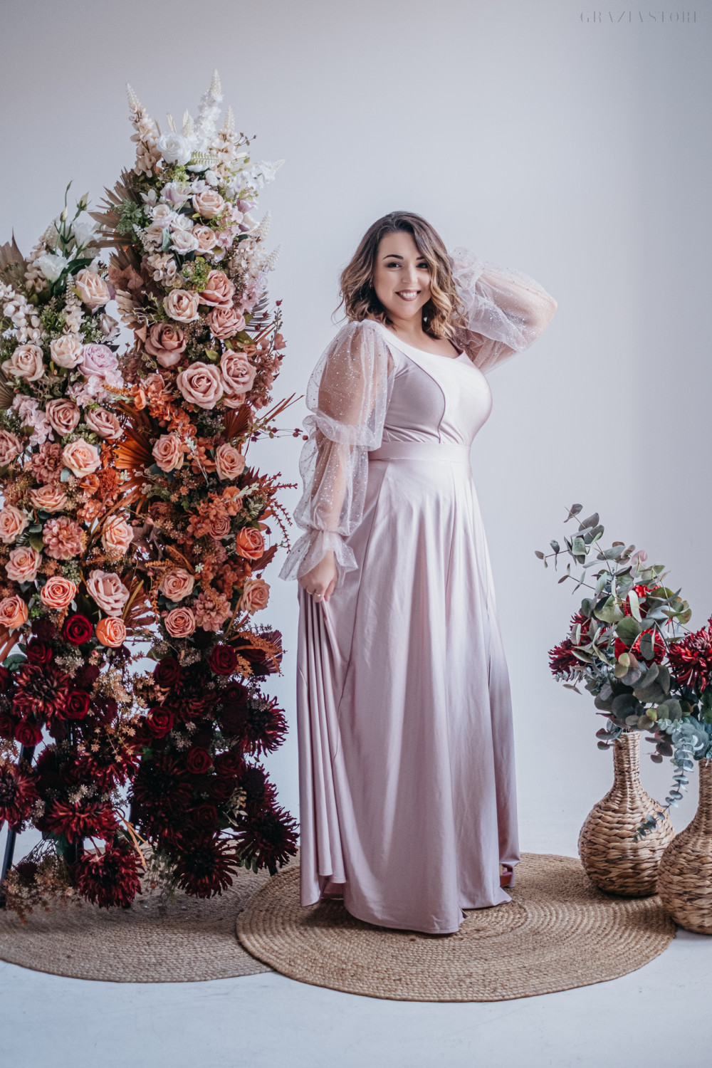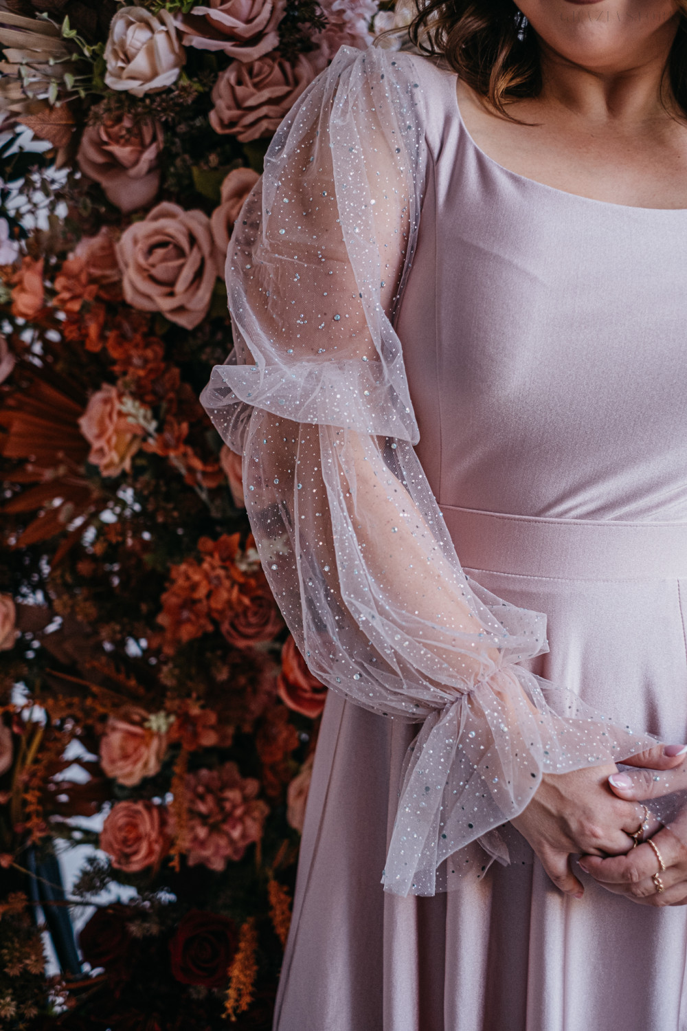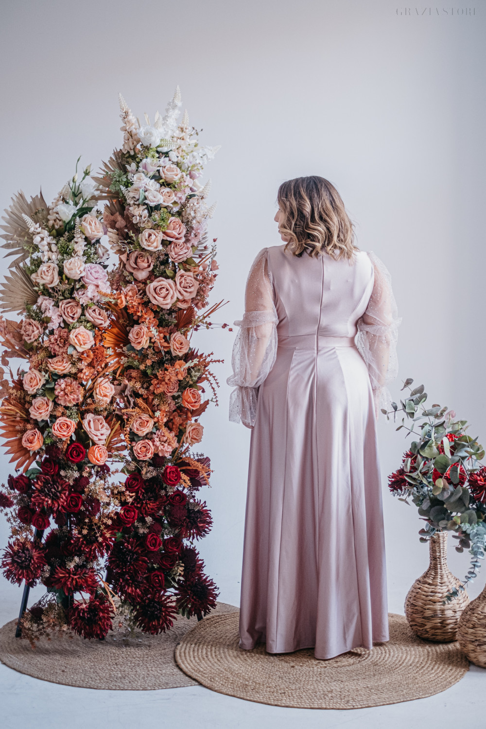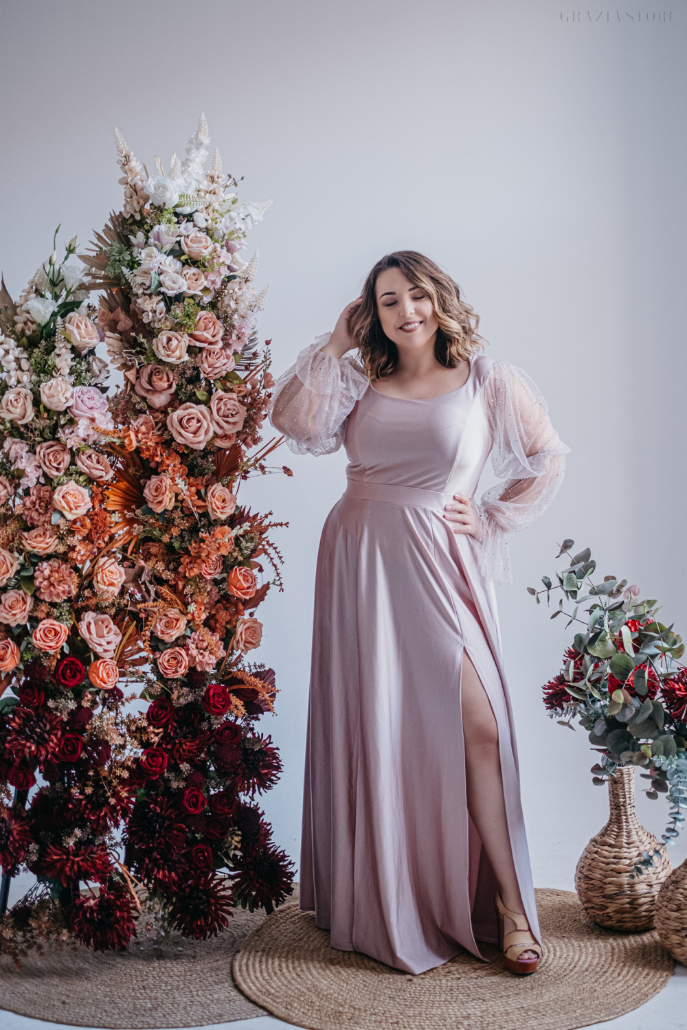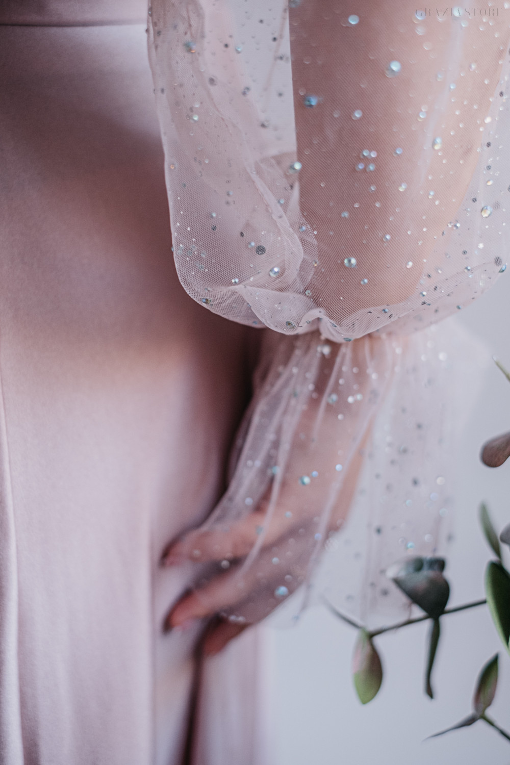 U dekoltázsú, derékban szabott maxi ruha, mélyen felsliccelt szoknyával és romantikus, hosszú, strasszköves tüll ujjakkal, púder színben, fényes, elasztikus anyagból.