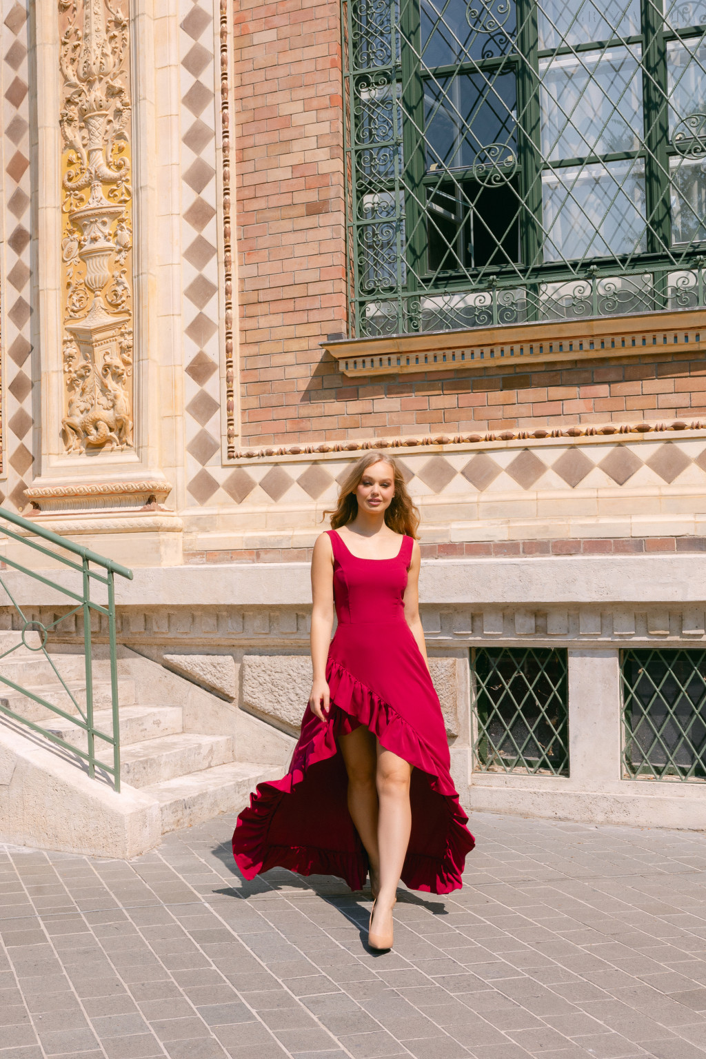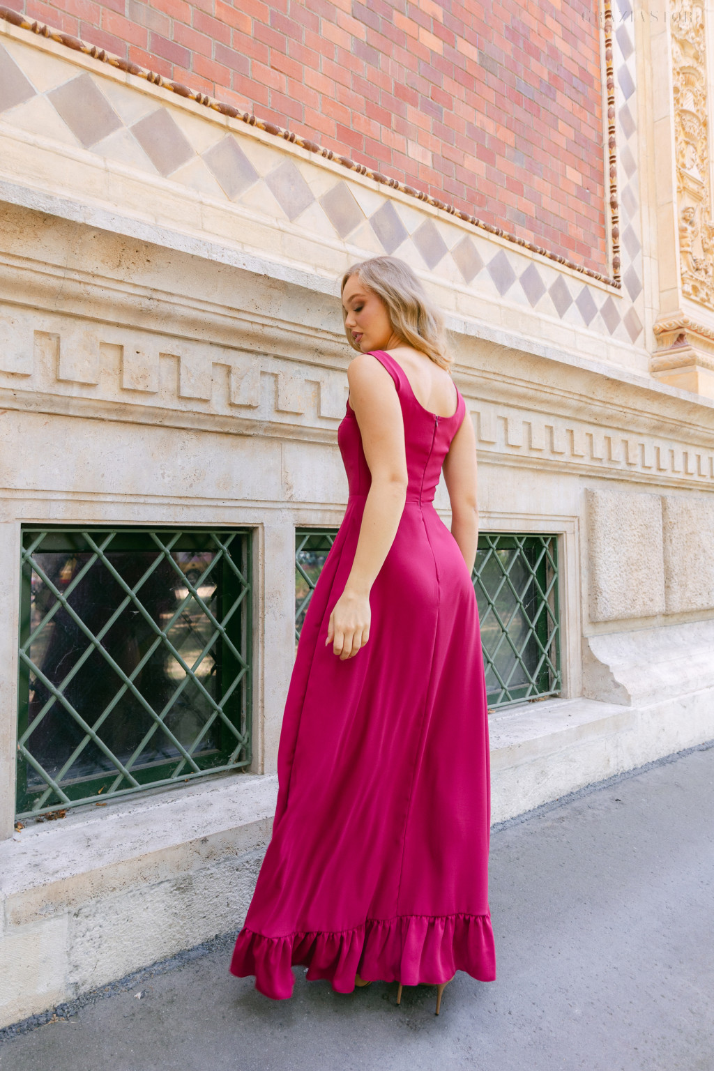 Bianka egy sötétmályva muszlinból készült, A-vonalú maxi ruha, amely kecses sliccével, aszimmetrikus fodros szoknyájával és letisztult, egyenes dekoltázsával azonnal magára vonja a tekintetet.