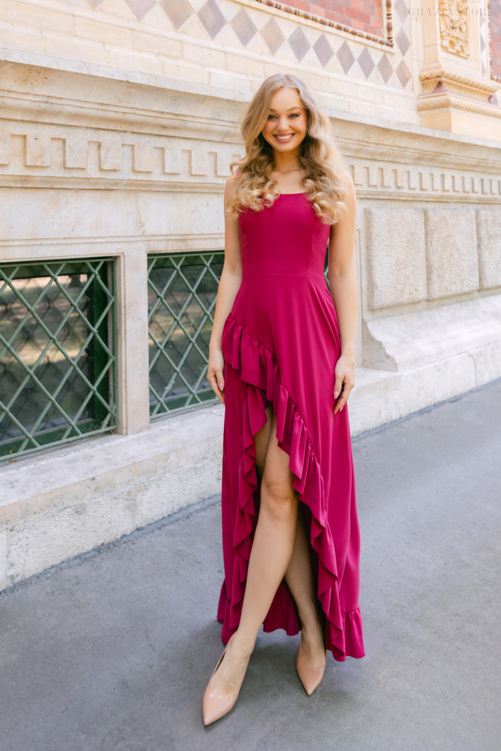 Bianka egy sötétmályva muszlinból készült, A-vonalú maxi ruha, amely kecses sliccével, aszimmetrikus fodros szoknyájával és letisztult, egyenes dekoltázsával azonnal magára vonja a tekintetet.