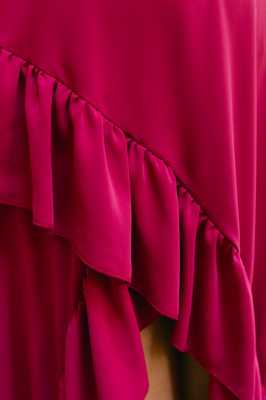 Bianka– sötétmályva muszlin alkalmi ruha aszimmetrikus fodros szoknyával