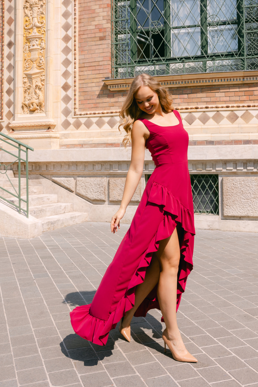 Bianka egy sötétmályva muszlinból készült, A-vonalú maxi ruha, amely kecses sliccével, aszimmetrikus fodros szoknyájával és letisztult, egyenes dekoltázsával azonnal magára vonja a tekintetet.