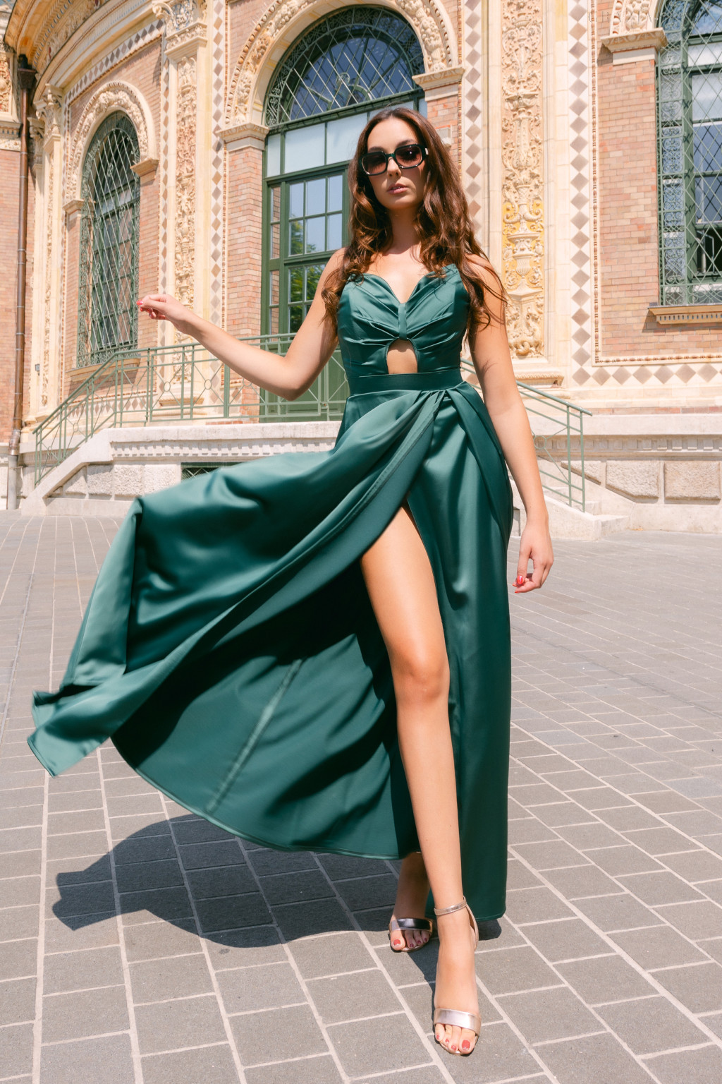 Ajsa egy sötétzöld szatén anyagból készült, pántnélküli maxi ruha, amely különleges dekoltázsával, izgalmas fűzős hátmegoldásával, rakásos, átlapolt szoknyájával és modern szabásával azonnal magára vonja a tekintetet.