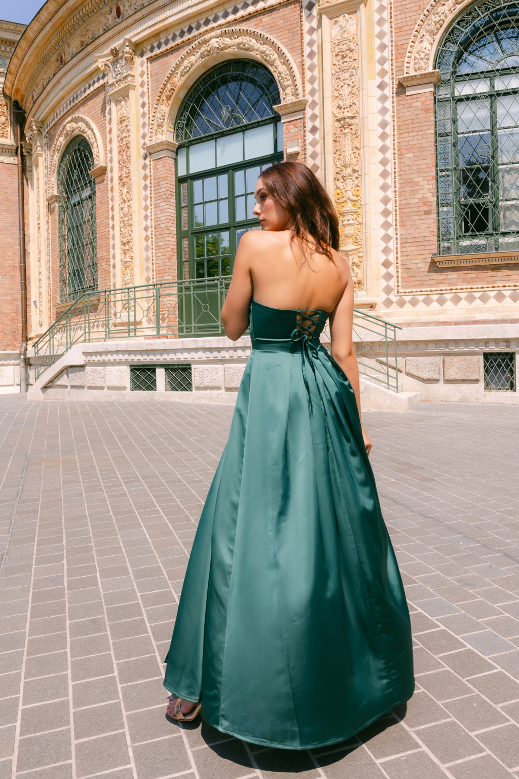A sima szatén ragyogó felülete fényűző eleganciát sugall, miközben lágyan követi a test vonalait. A pántnélküli felsőrész kiemeli a vállak és a nyak vonalát, a dekoltázs pedig nőies, kifinomult hatást kelt. A hason elhelyezett apró nyílás játékos, modern részlet, míg a rakott, átlapolt maxi szoknya légies mozgást biztosít, optikailag nyújtva az alakot. A fűzős hátrész gondoskodik arról, hogy a ruha tökéletesen igazodjon a testhez, kiemelve a nőies sziluettet.