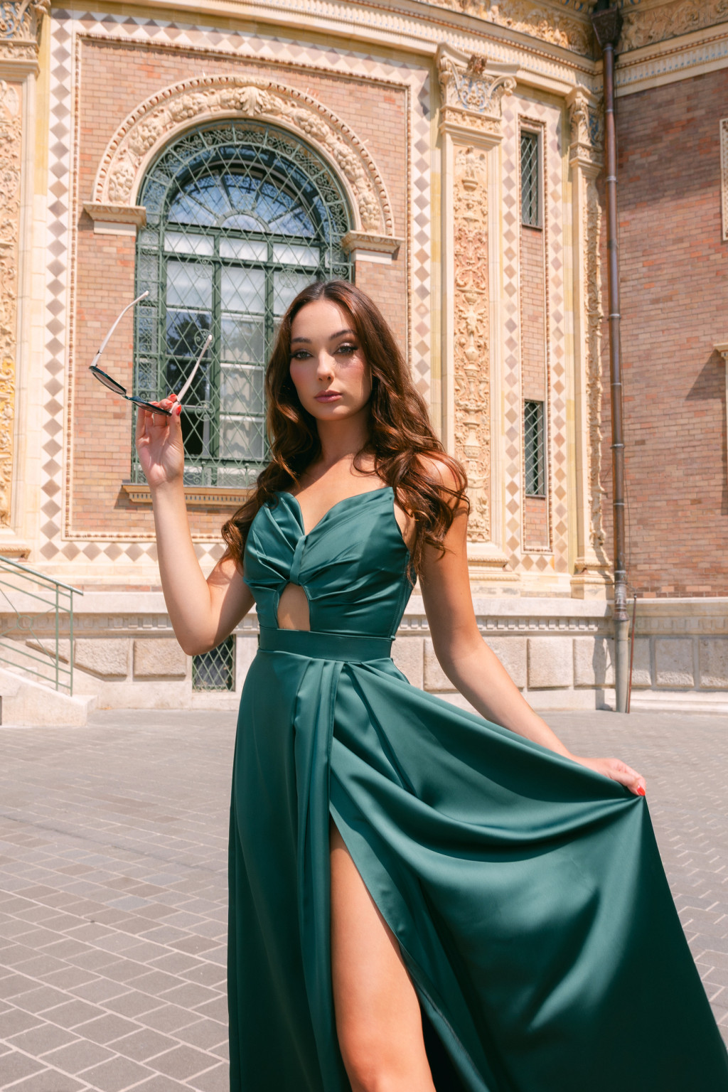 Ajsa egy sötétzöld szatén anyagból készült, pántnélküli maxi ruha, amely különleges dekoltázsával, izgalmas fűzős hátmegoldásával, rakásos, átlapolt szoknyájával és modern szabásával azonnal magára vonja a tekintetet.