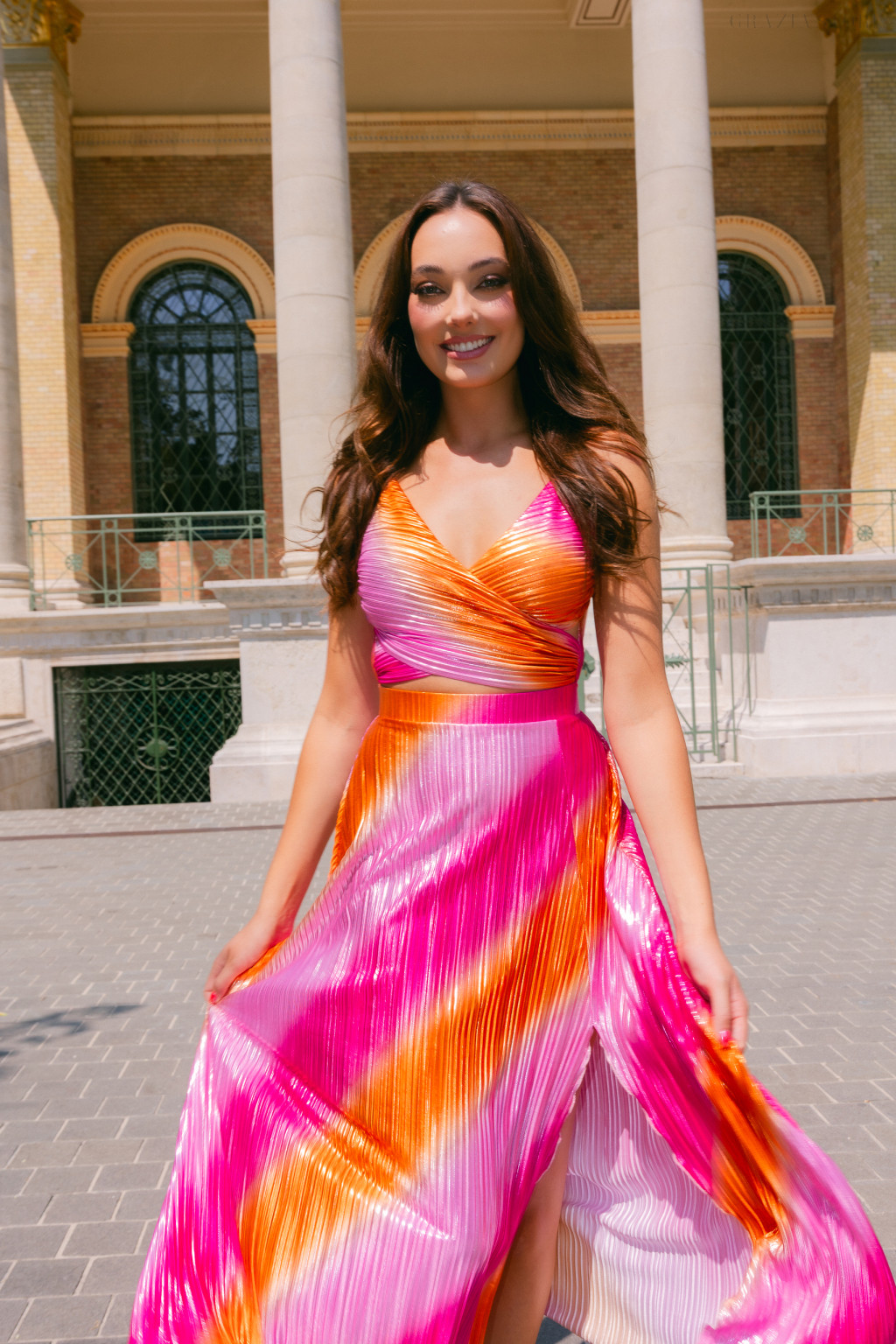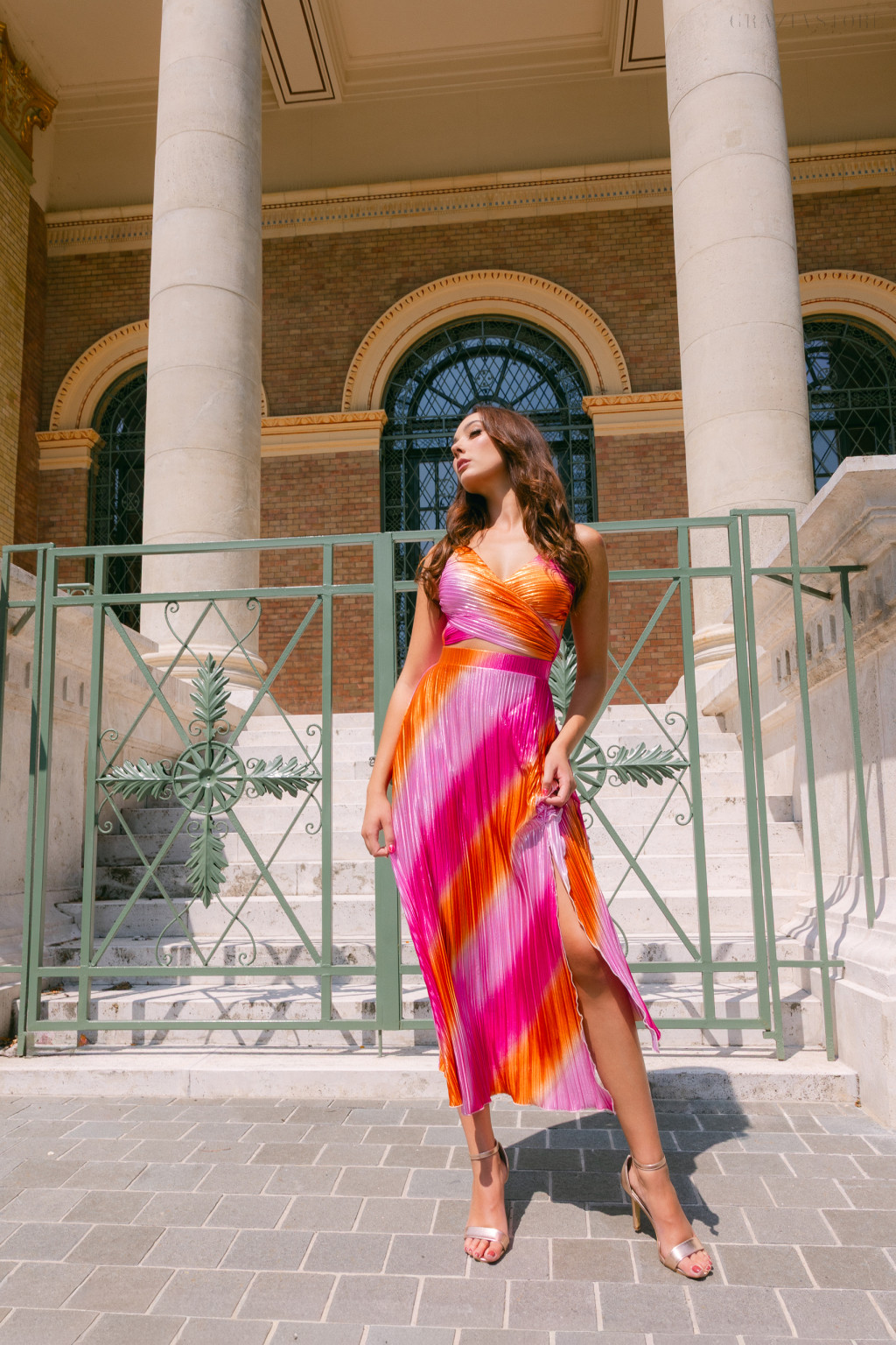 A pliszírozott anyag minden mozdulatnál elegánsan áramlik, miközben a vibráló színek – rózsaszín, narancs és pink árnyalatok – fiatalos, lendületes energiát sugároznak. A spagetti pántok kiemelik a vállak finomságát, a crop-top fazon optikailag karcsúsítja a derekat, míg a felsliccelt szoknya játékos dinamizmust kölcsönöz, diszkréten megmutatva a láb vonalát. A midi hossz modern és könnyed, így a ruha egyszerre kényelmes és feltűnően nőies.