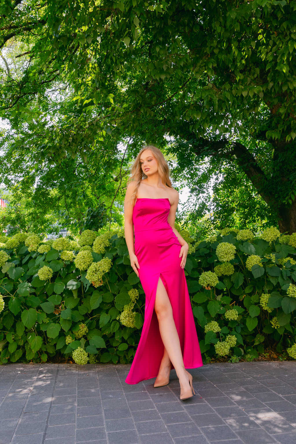 Marilyn – pántnélküli szatén maxi ruha magenta színben, sliccelt szoknyával