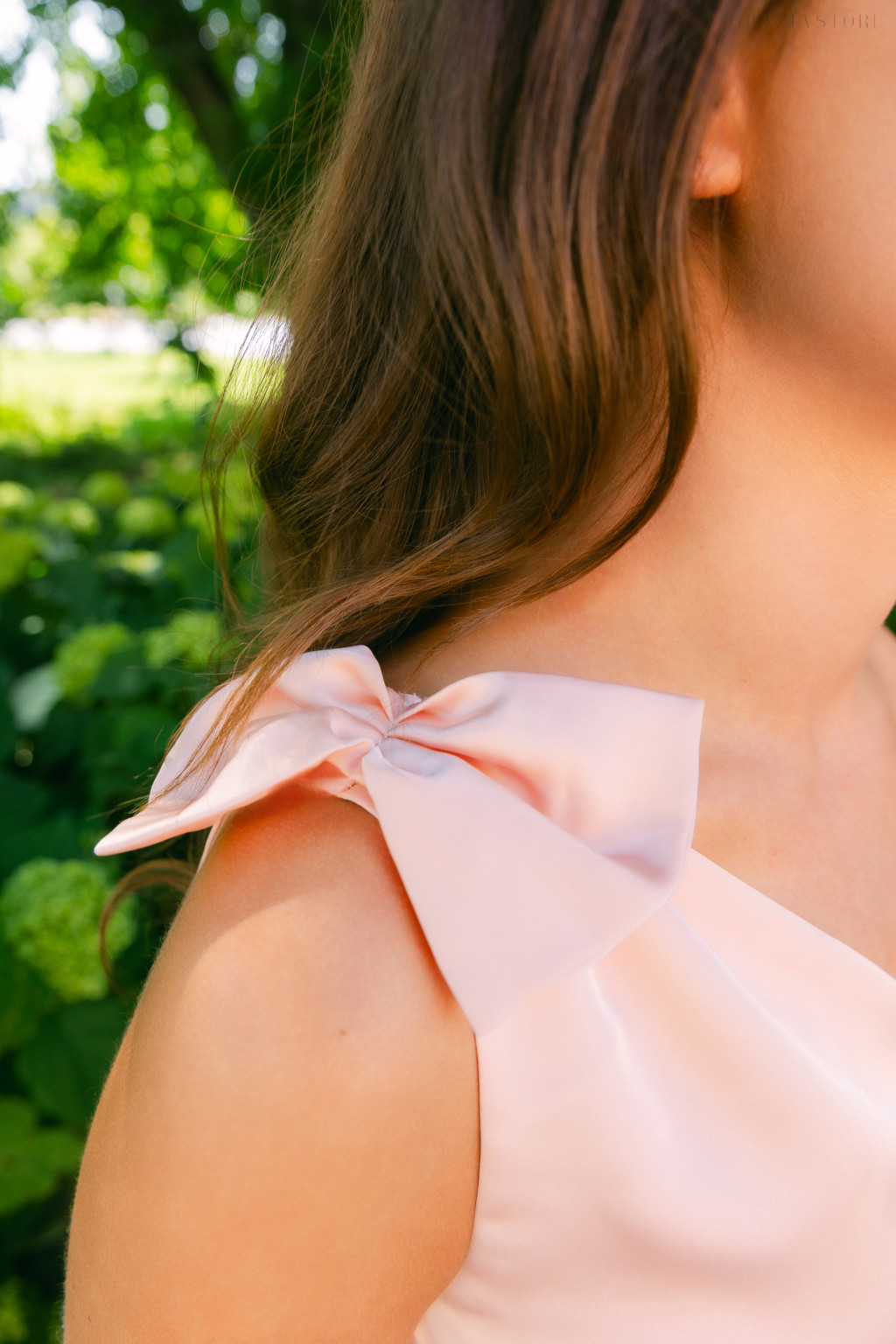 Féloldalas felsőrésze egyedi és modern vonalat ad a megjelenésnek, miközben finom masnis díszítése bájos, nőies kiegészítőként emeli ki a vállat. A szoknya átlapolt szabása lágyan követi a mozgást, áramló sziluettet kölcsönözve, amely minden lépésnél romantikus könnyedséget sugároz.