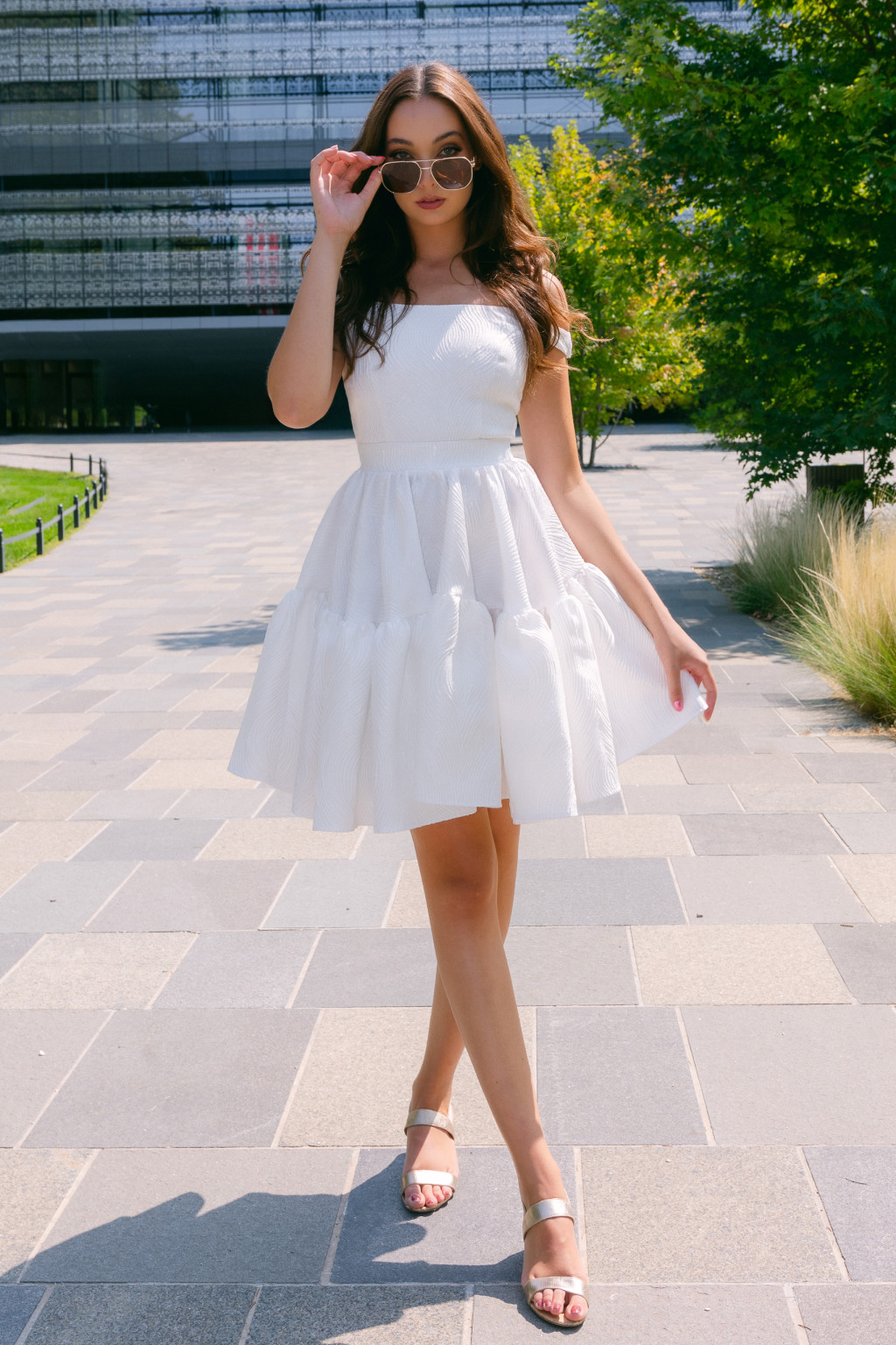 Fridra - fehér jacquard mini ruha ejtett vállakkal és rakott szoknyával