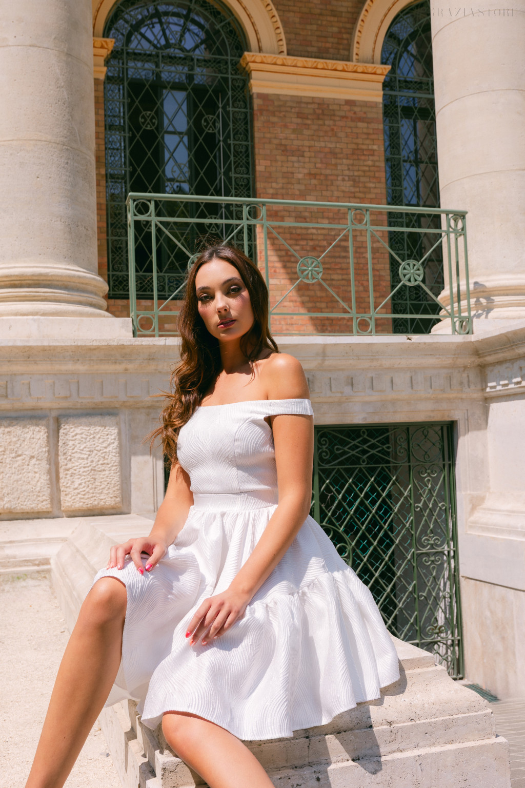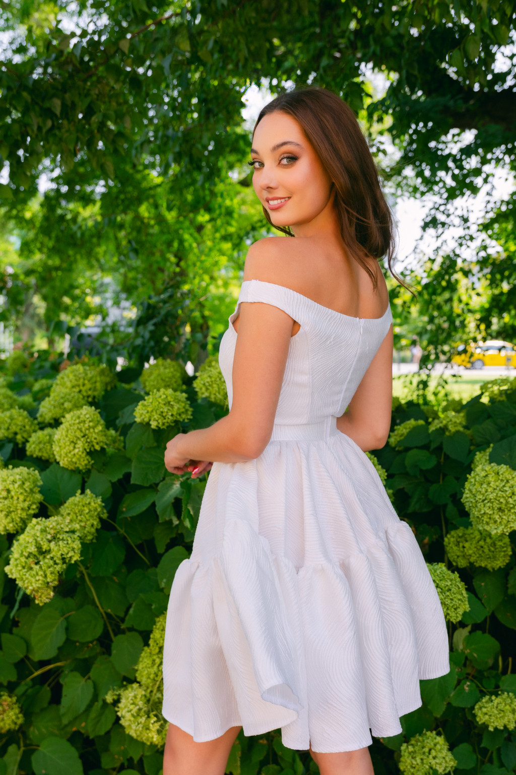 Ejtett vállai romantikus, nőies vonalat rajzolnak, finoman kiemelve a dekoltázst és a vállakat, míg a pörgős, rakott mini szoknya játékos lendületet visz minden mozdulatodba. A jacquard szövet különleges hullámos mintázata és gazdag textúrája extra mélységet és eleganciát kölcsönöz, amely még inkább kiemeli a ruha egyediségét. A fehér árnyalat tisztaságot, frissességet és letisztult ragyogást sugároz – legyen szó nappali eseményről vagy esti ünneplésről.