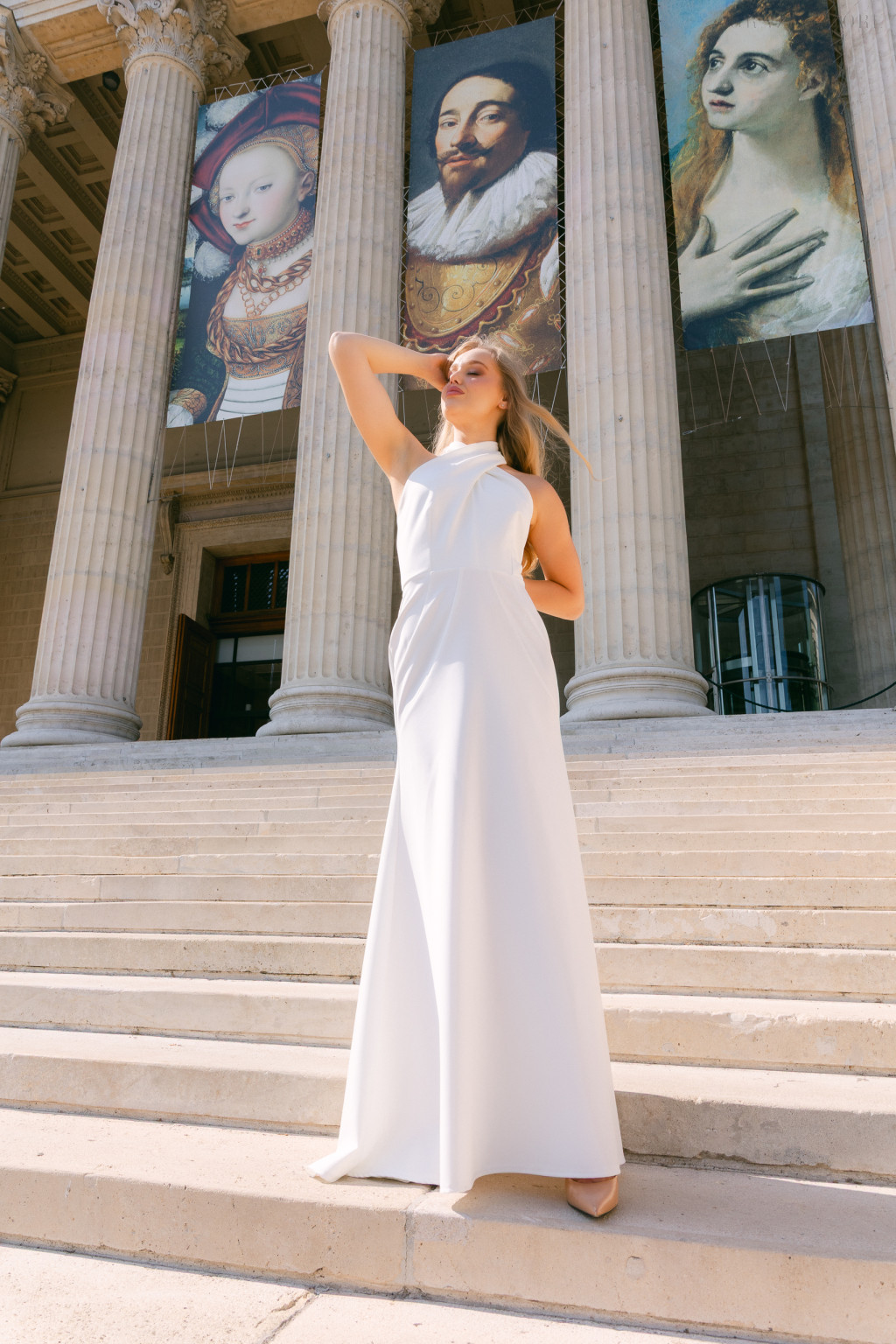 A fehér árnyalat üde, kifinomult és ragyogó, amely tökéletesen harmonizál nappali fényben és esti hangulatban is. Ez a ruha azoknak szól, akik szeretnék magukat egyszerre nőiesnek, magabiztosnak és különlegesnek érezni.