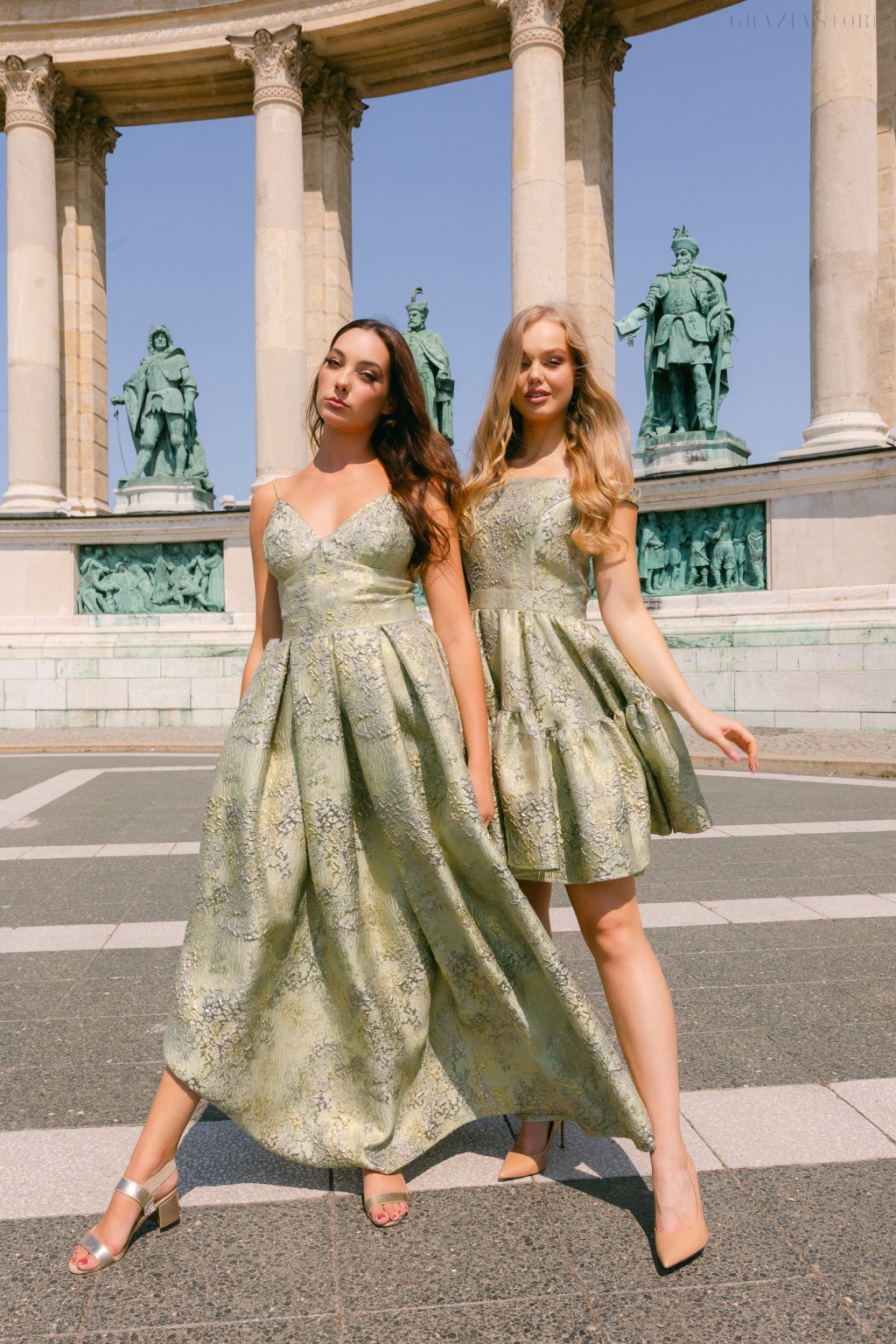 Halványzöld alapon ragyogó arany és ezüst dombornyomott mintázata olyan, mintha egy ékszert viselnél ruhaként. A rövid, bőségesen rakott szoknya pörgős és dinamikus mozgást biztosít, amely minden lépést könnyed eleganciával tölt meg – legyen szó táncról vagy egy kifinomult belépőről. A jacquard szövet vastagabb textúrája tartást ad, miközben luxusérzetet sugall, a fémes árnyalatok pedig életre keltik a ruha különleges karakterét.