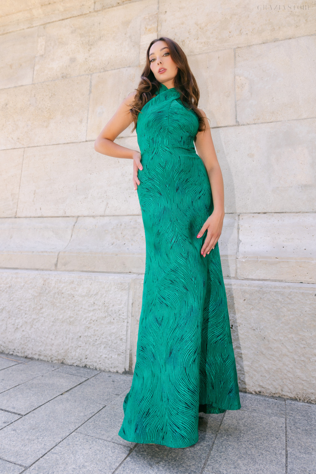 A sötétzöld alapon fekete hullámos mintázat különleges, luxus hatást kelt, a jacquard szövet gazdag textúrája pedig minden részletében prémium megjelenést sugall. A nyakban megkötős, elöl keresztezett felsőrész játékosan emeli ki a dekoltázst, egyedi, mégis kifinomult stílust kölcsönözve. A szűkszabású, testhez simuló fazon kiemeli az alakot, míg a maxi hosszúság eleganciát és magabiztosságot sugall.