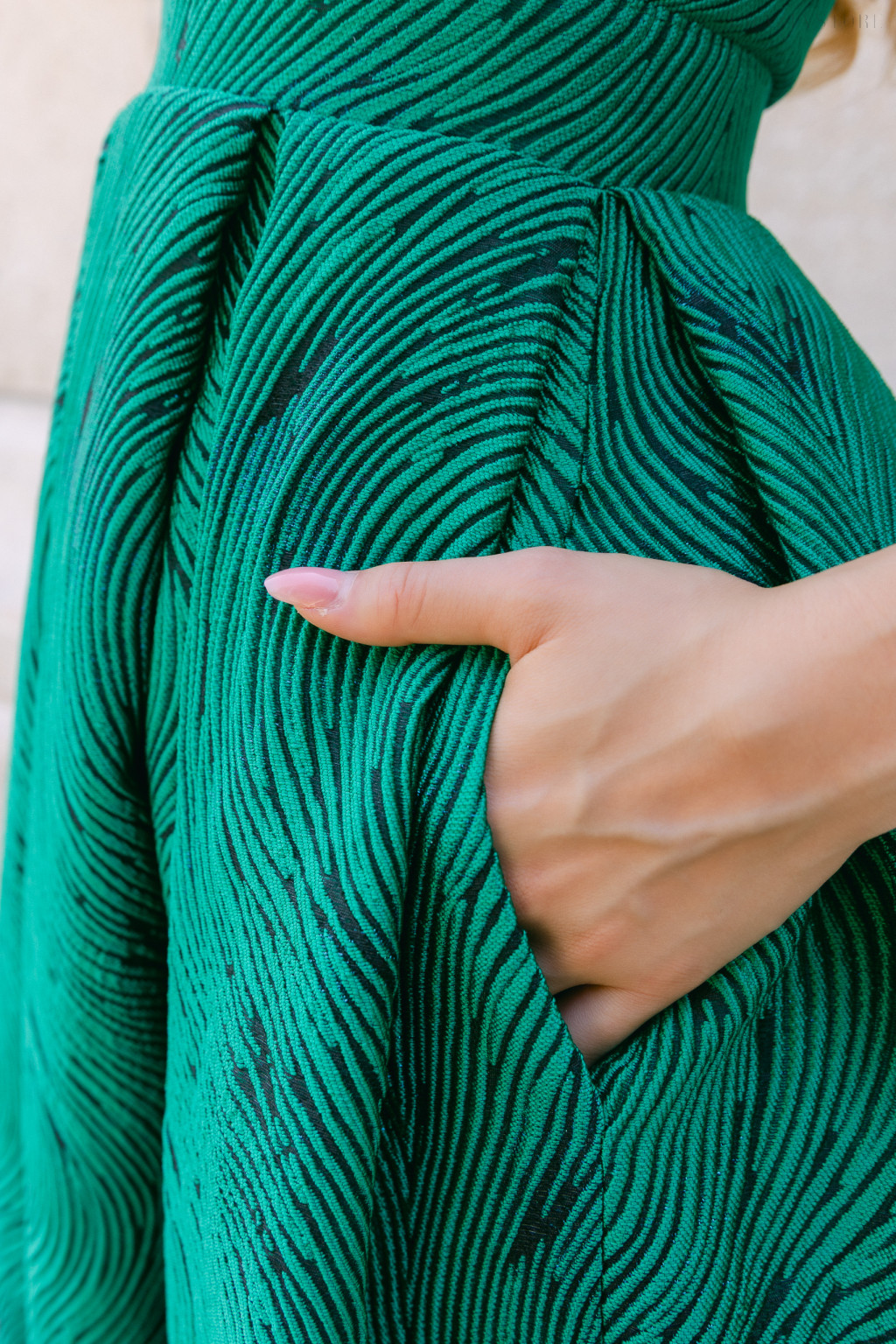 Chloe – anyagában mintás jacquard maxi ruha szív kivágással sötétzöld színben