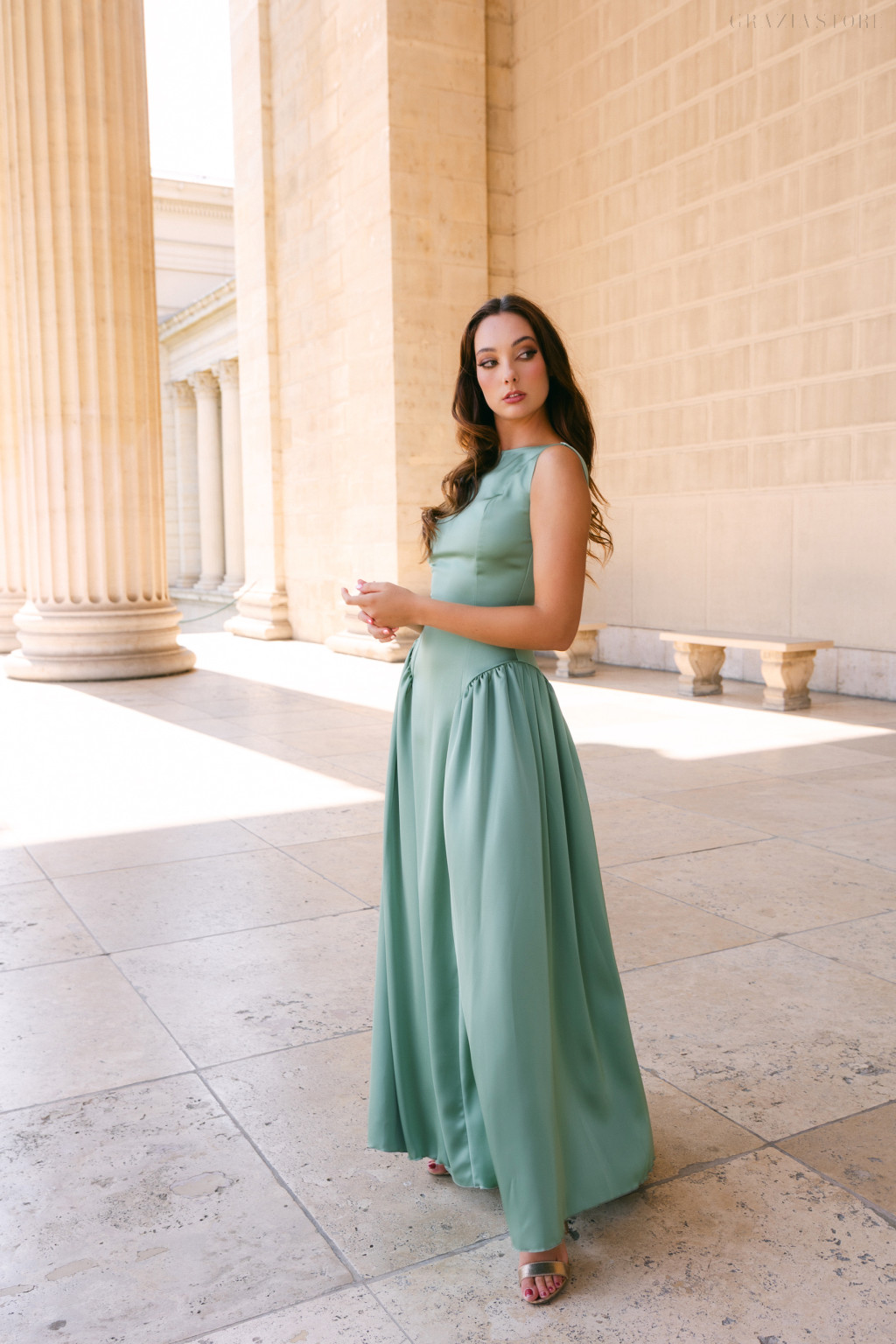 Niko – lágy szatén maxi ruha csípővonalban szabott fazonnal zsálya színben