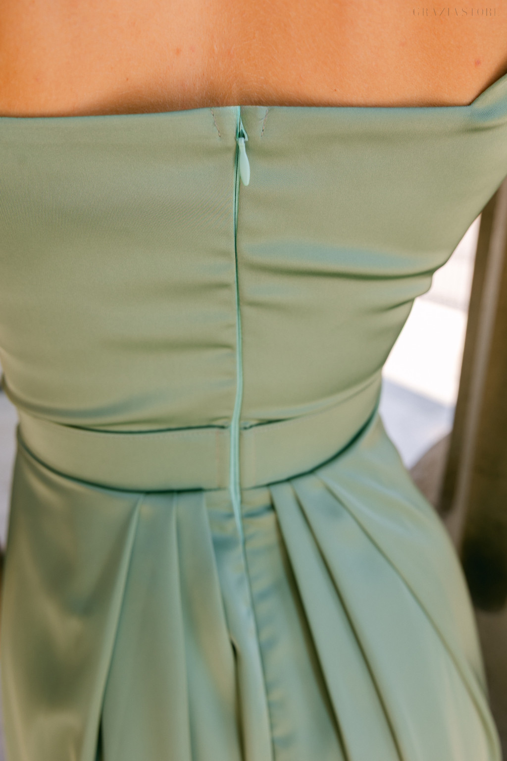 Maya – zsálya színű szatén alkalmi ruha átlapolt rakásos szoknyával
