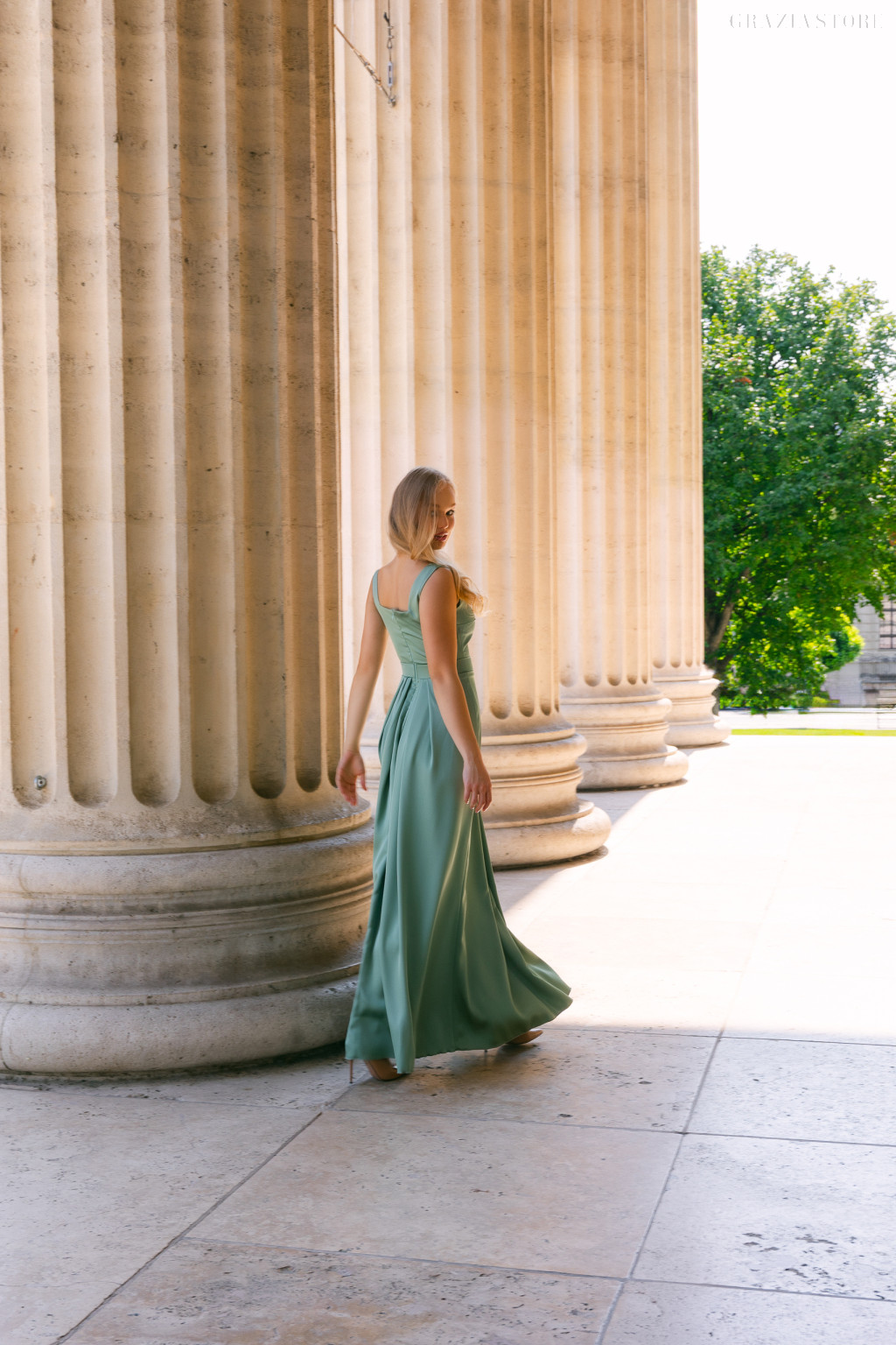 Maya egy zsálya színű, lágy szaténból készült alkalmi ruha, amely letisztult, elegáns felsőrésszel és átlapolt, rakásos maxi szoknyával varázsolja el a megjelenést.