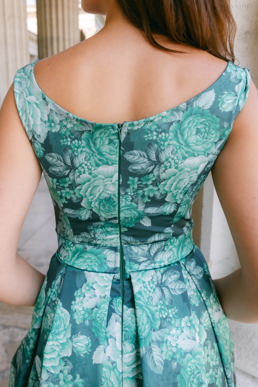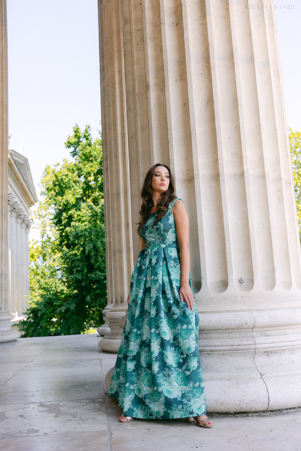 A virágmintás design elegáns és időtlen, amely játékos frissességet visz a klasszikus maxi ruhába. A fényes szatén anyag luxust sugall, a réteges, többrakásos szoknya pedig minden mozdulatnál áramló könnyedséget és kifinomult térfogatot biztosít, így a ruha szinte életre kel, amikor megmozdulsz benne. A sötétzöld alap és a gazdag virágminták különleges kontrasztot teremtenek, melyek esti fényben és természetközeli környezetben egyaránt ragyognak.