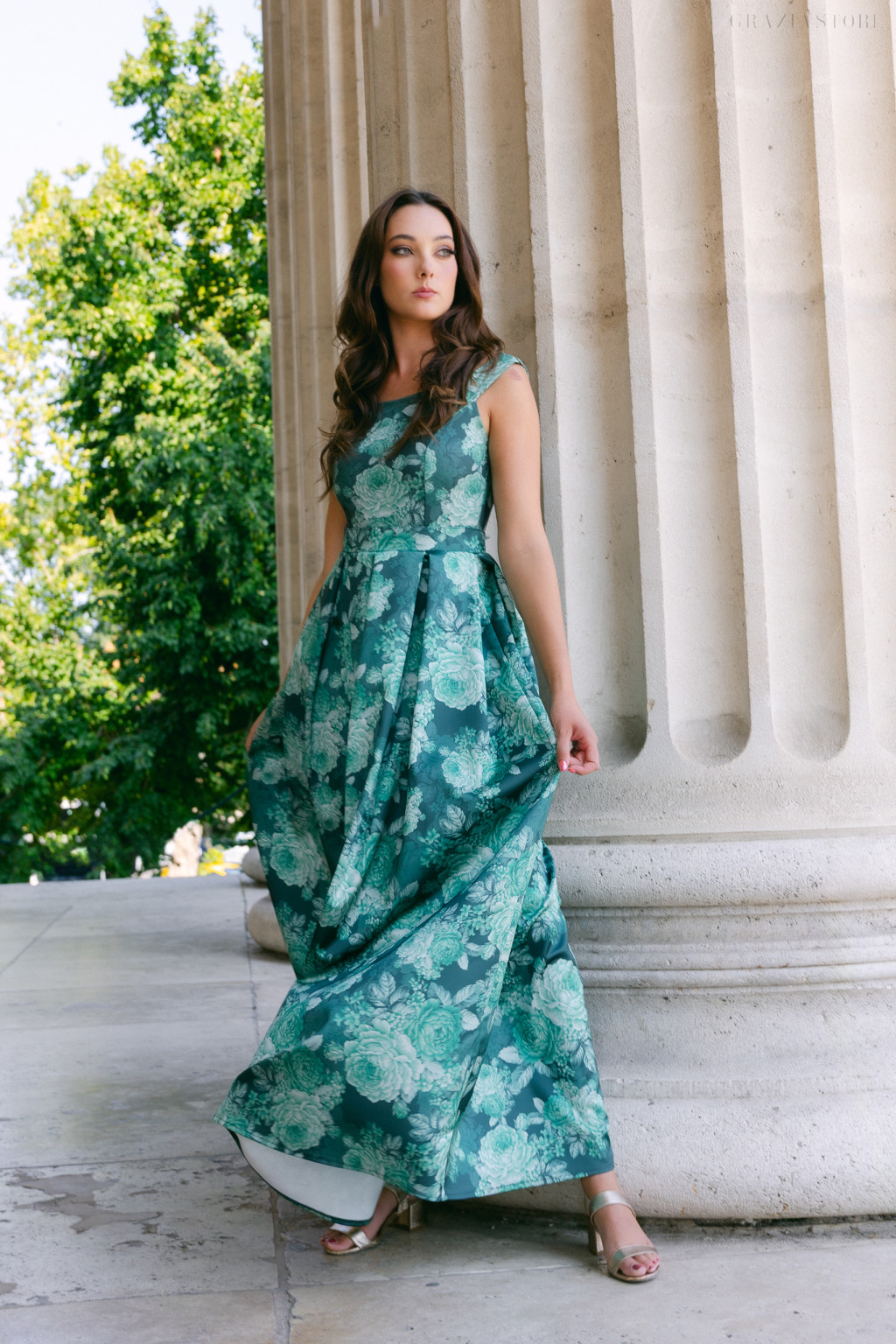 A virágmintás design elegáns és időtlen, amely játékos frissességet visz a klasszikus maxi ruhába. A fényes szatén anyag luxust sugall, a réteges, többrakásos szoknya pedig minden mozdulatnál áramló könnyedséget és kifinomult térfogatot biztosít, így a ruha szinte életre kel, amikor megmozdulsz benne. A sötétzöld alap és a gazdag virágminták különleges kontrasztot teremtenek, melyek esti fényben és természetközeli környezetben egyaránt ragyognak.
