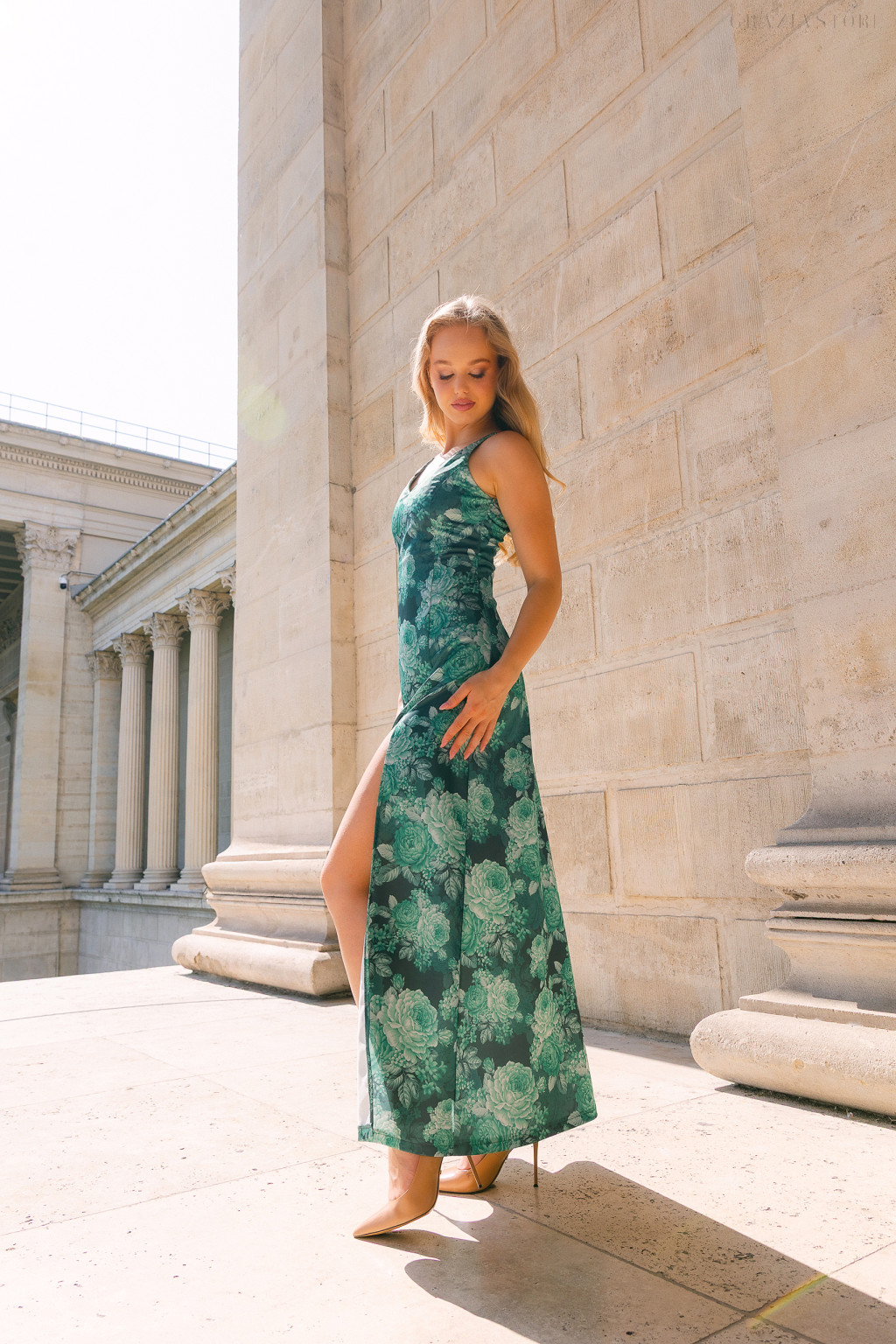 Annabella egy varázslatos szatén maxi ruha, amelyet romantikus virágmintája és kifinomult szabása tesz igazán különlegessé. A V alakú, diszkrét dekoltázs nőies, finoman csábító vonalat ad, miközben a V hátkivágás izgalmas és modern részletként vonzza a tekintetet. A szatén anyag sima, fényes felülete luxusérzetet áraszt, lágyan követi az alakot, és minden lépésnél elegánsan játszik a fénnyel.