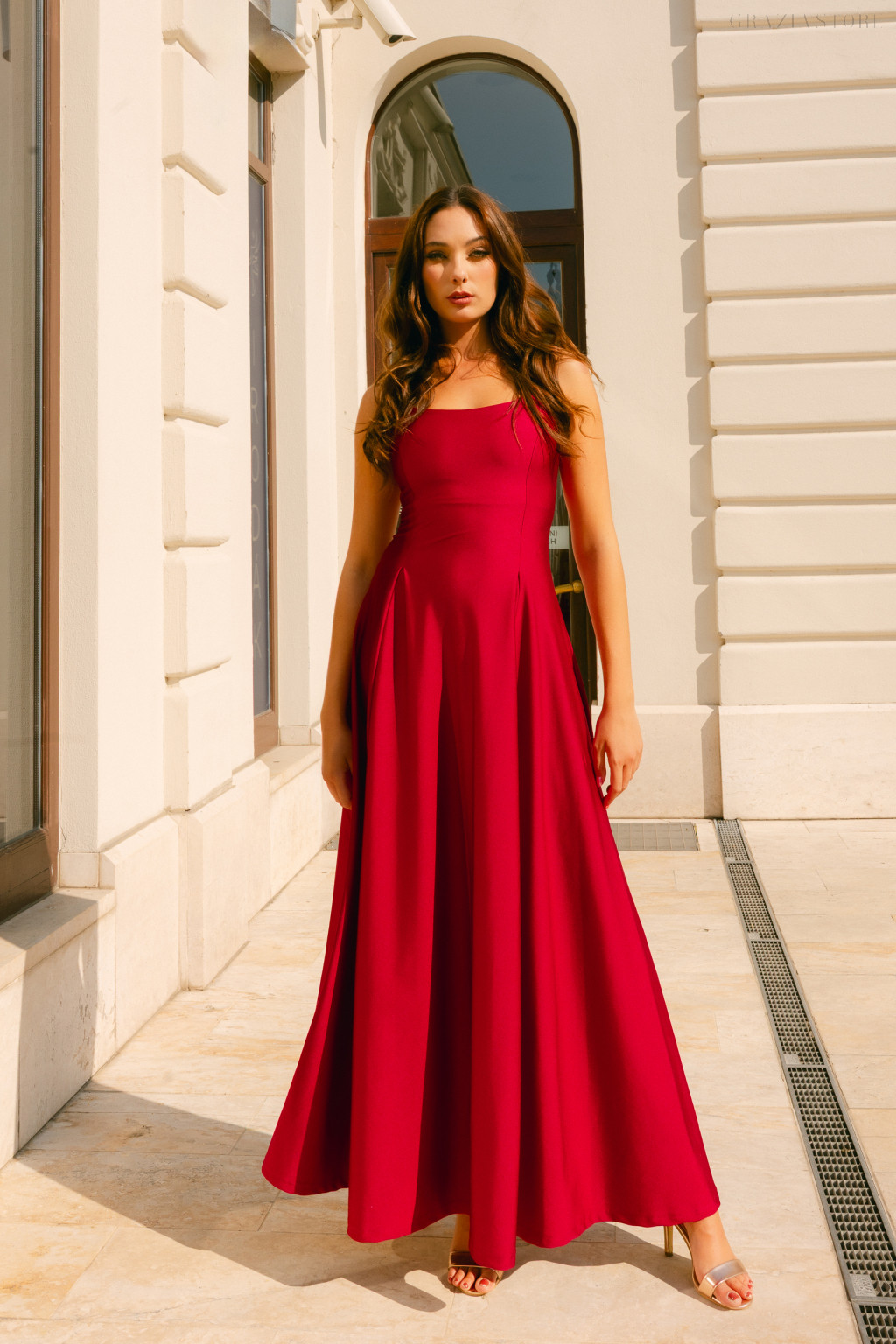 Dominika egy elasztikus anyagú, bordó (shanghai) színű alkalmi maxi ruha, amelynek vastagpántos felsőrésze és diszkrét dekoltázsa elegáns, mégis kényelmes viseletet biztosít. A vastag pántok stabilitást és modern stílust nyújtanak, míg a finom dekoltázs nőies, de visszafogott hatást kelt.