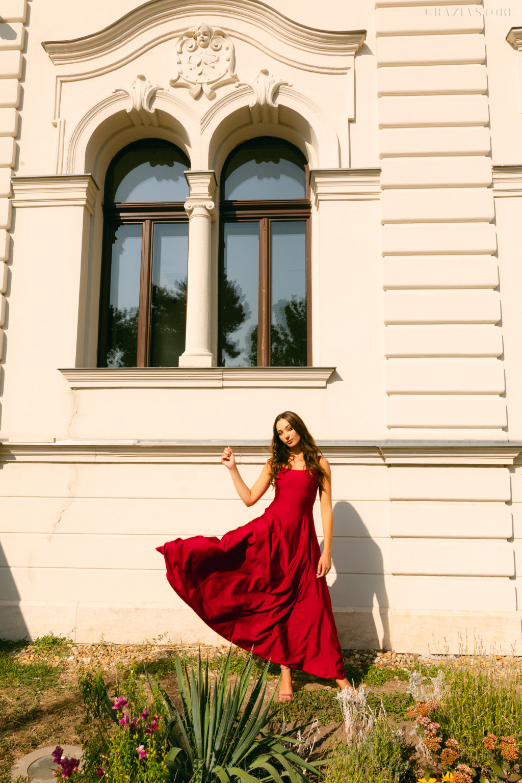 A ruha különlegessége, hogy nem derékban szabott, hanem a szűkebb felsőrészből lágyan, A-vonalban bővül lefelé. Ez a megoldás nyújtja az alakot, miközben könnyed mozgásszabadságot biztosít, és finoman kiemeli a nőies sziluettet anélkül, hogy túl szorosan körbefogná a derekat.