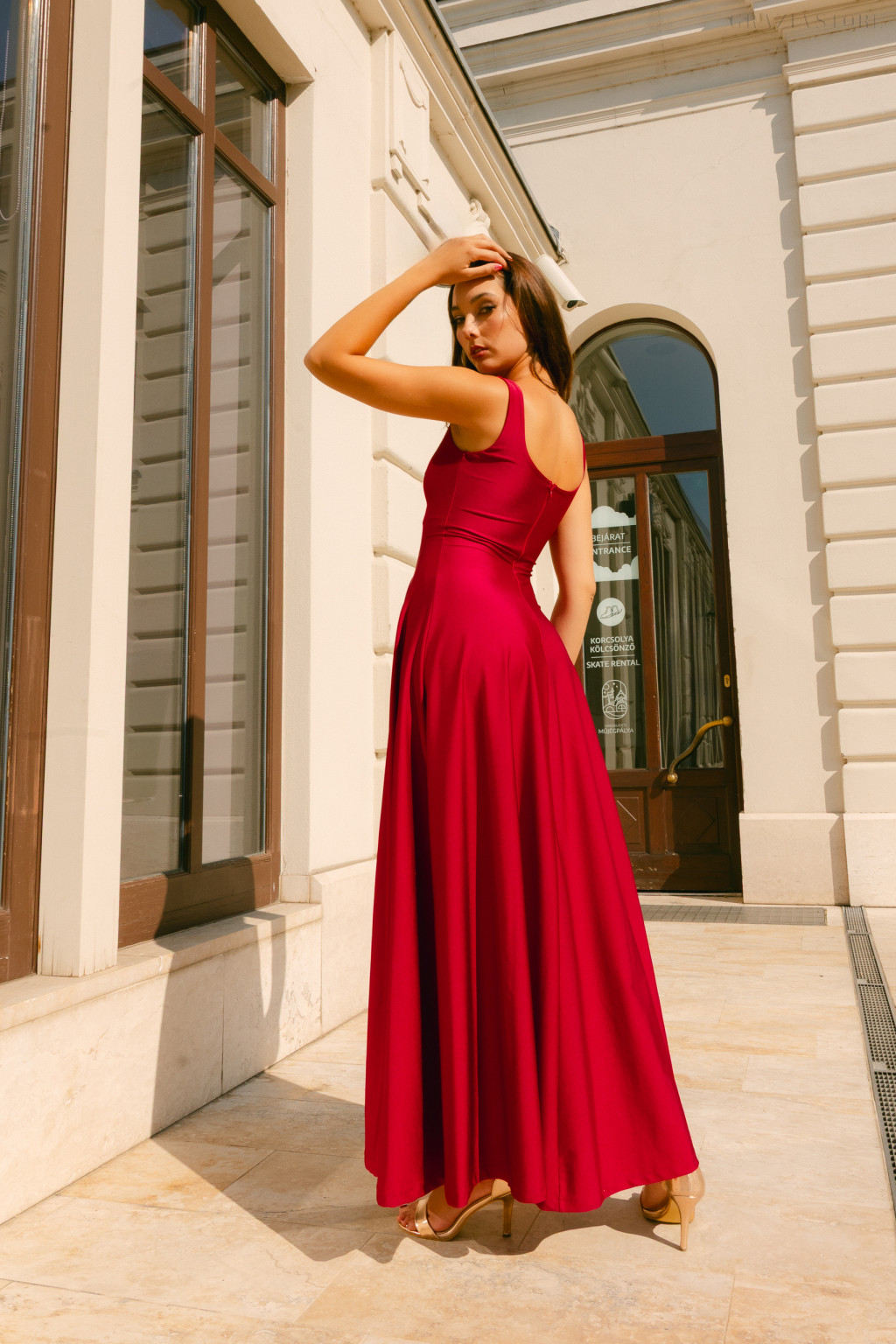 Az elasztikus anyag rugalmassága kényelmet ad, a bordó árnyalat pedig gazdagságot és kifinomultságot sugároz. Ez a letisztult, elegáns maxi ruha ideális választás esküvőkre, bálokra vagy bármely alkalomra, ahol a stílus és a kényelem tökéletes összhangja a cél.