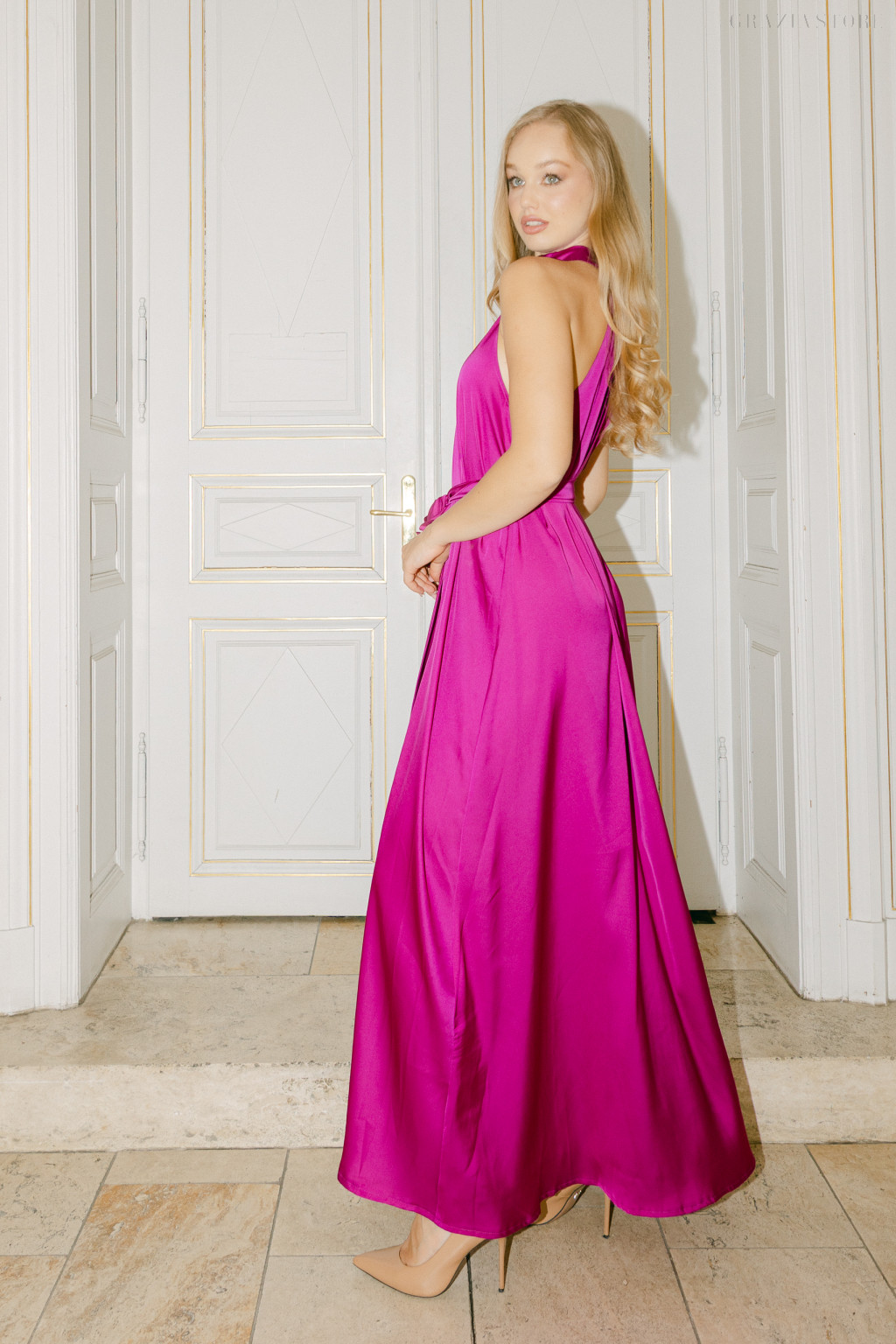 Olga – Magenta light szatén maxi ruha megkötős nyakkal és bő szabással