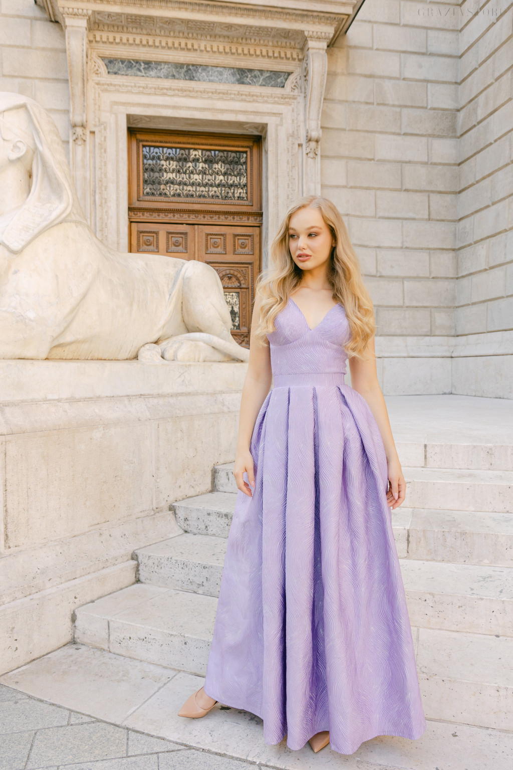 Szonja egy igazán lenyűgöző maxi ruha, amely hercegnői megjelenést és modern eleganciát ötvöz. A lila árnyalat magával ragadó, különleges és nőies, míg az anyagában mintás jacquard szövet gazdag textúrájával és finom mintázatával luxusérzetet áraszt. A több rakású, A vonalú szoknya bőséges térfogatot biztosít, miközben praktikus zsebei könnyedséget és modern stílust csempésznek a ruhába.