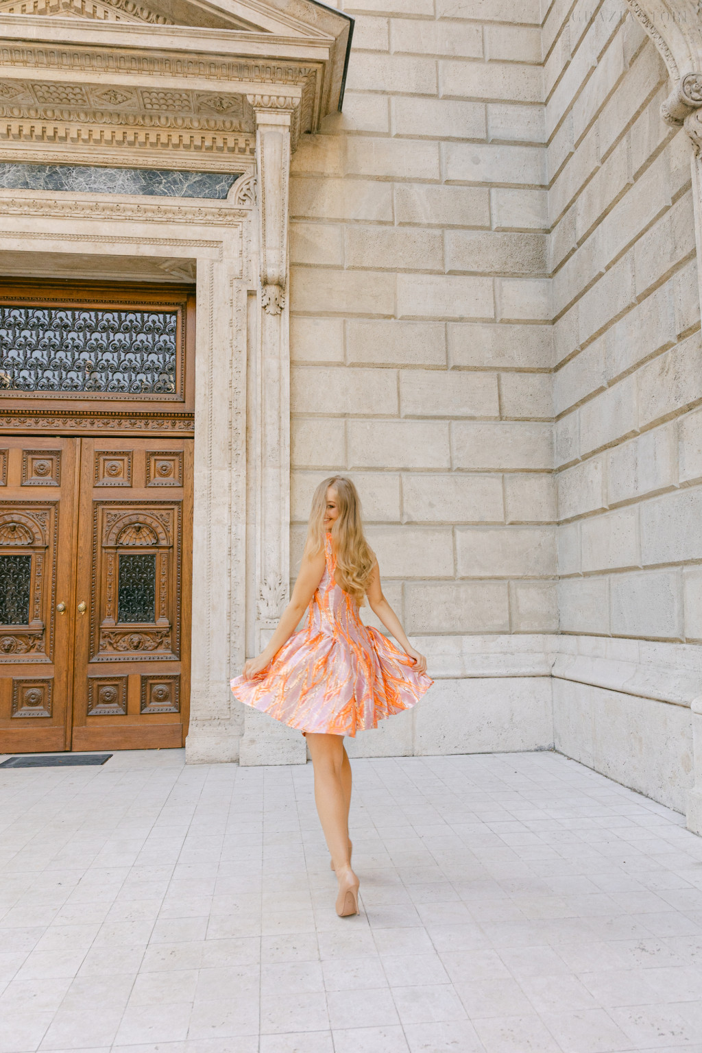 Niko mini ruha a modern nőiesség és az időtlen elegancia tökéletes egyensúlyát teremti meg. Anyagában mintás jacquard szövete púderes alapon aranyló és narancs árnyalatú, absztrakt hullámmintával díszített, amely minden mozdulatnál életre kel, és luxusfényével garantáltan magára vonja a tekinteteket. A ruha különlegessége az alacsonyabban szabott derékrész, amely kiemeli a sziluettet és azonnal divatos, nagyvárosi sikket sugároz.